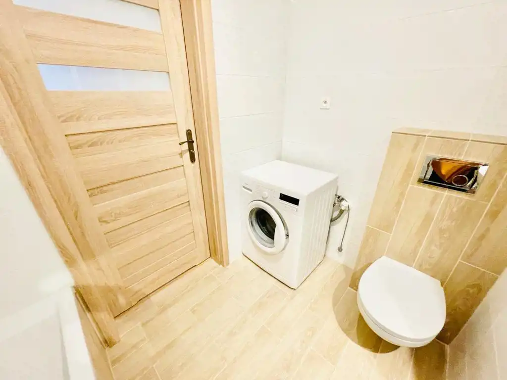 W kuchni znajdują się meble, piekarnik, kuchenka gazowa, okap, w łazience pralka, wanna i toaleta, a w przedpokoju szafa. Dodatkowo sofa, łóżko, komoda, etc.