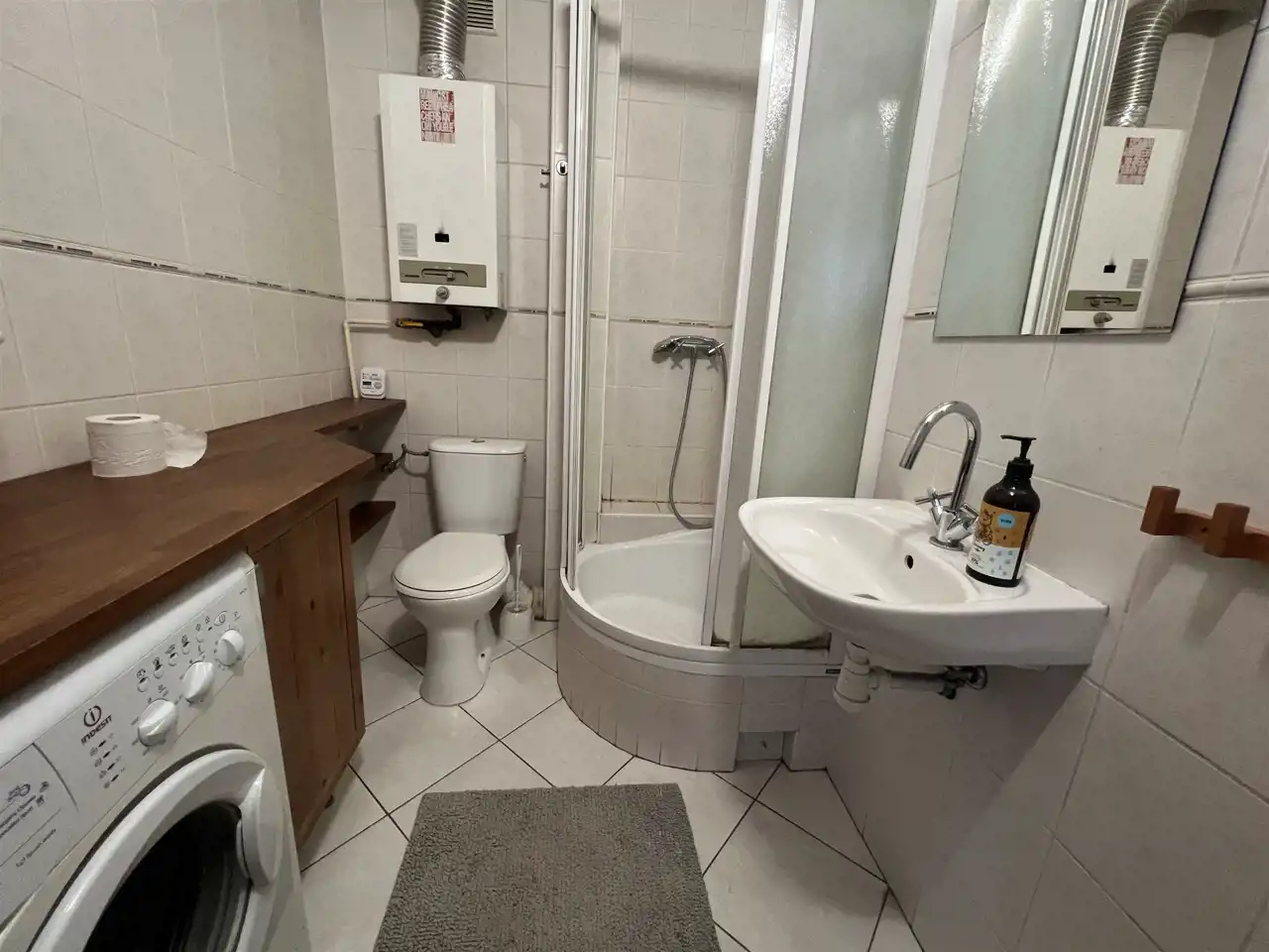 Łazienka z kabiną prysznicową i pralką.