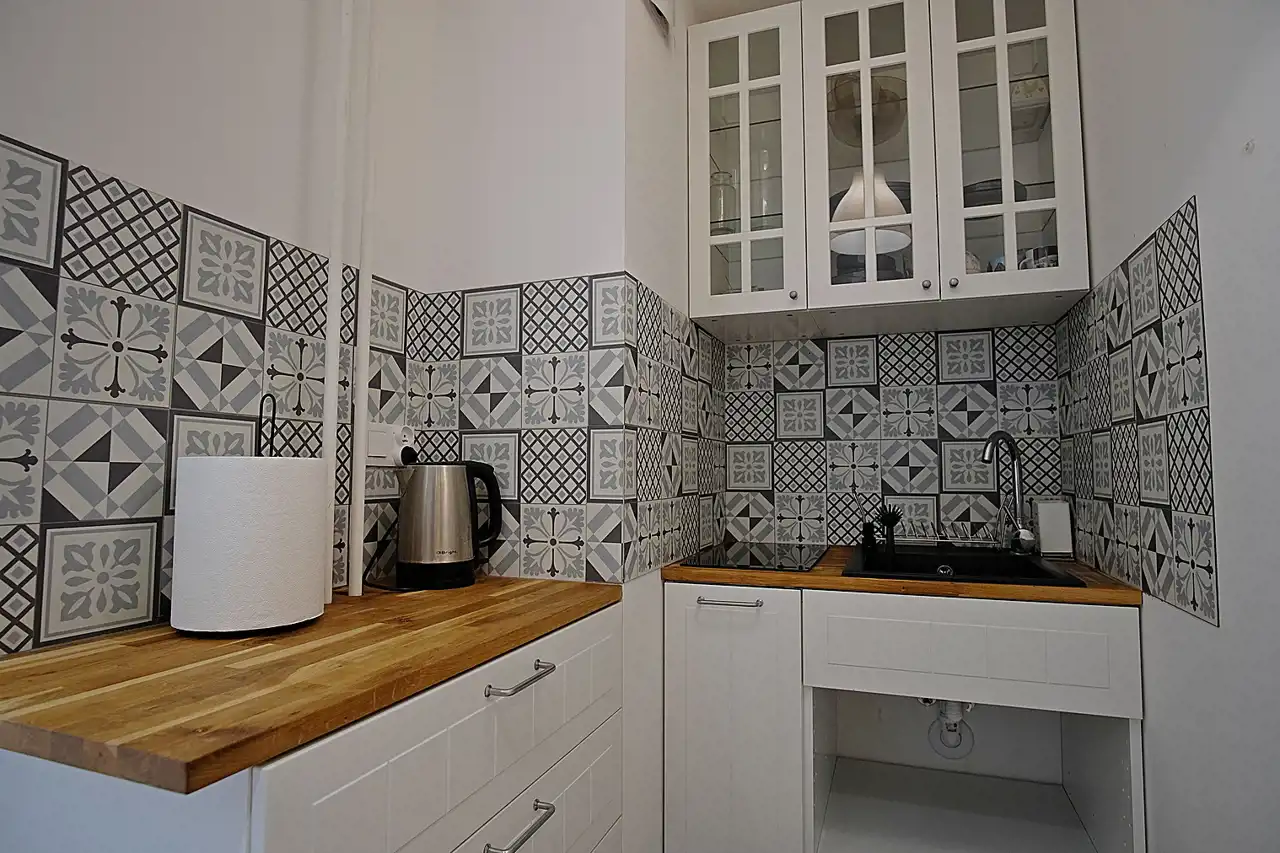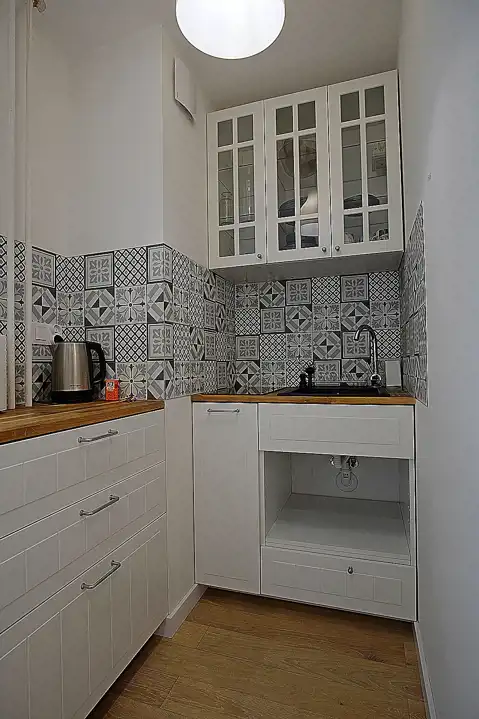 W aneksie kuchennym płyta elektryczna ( w mieszkaniu nie ma gazu), szafki, blat i drobne wyposażenie.