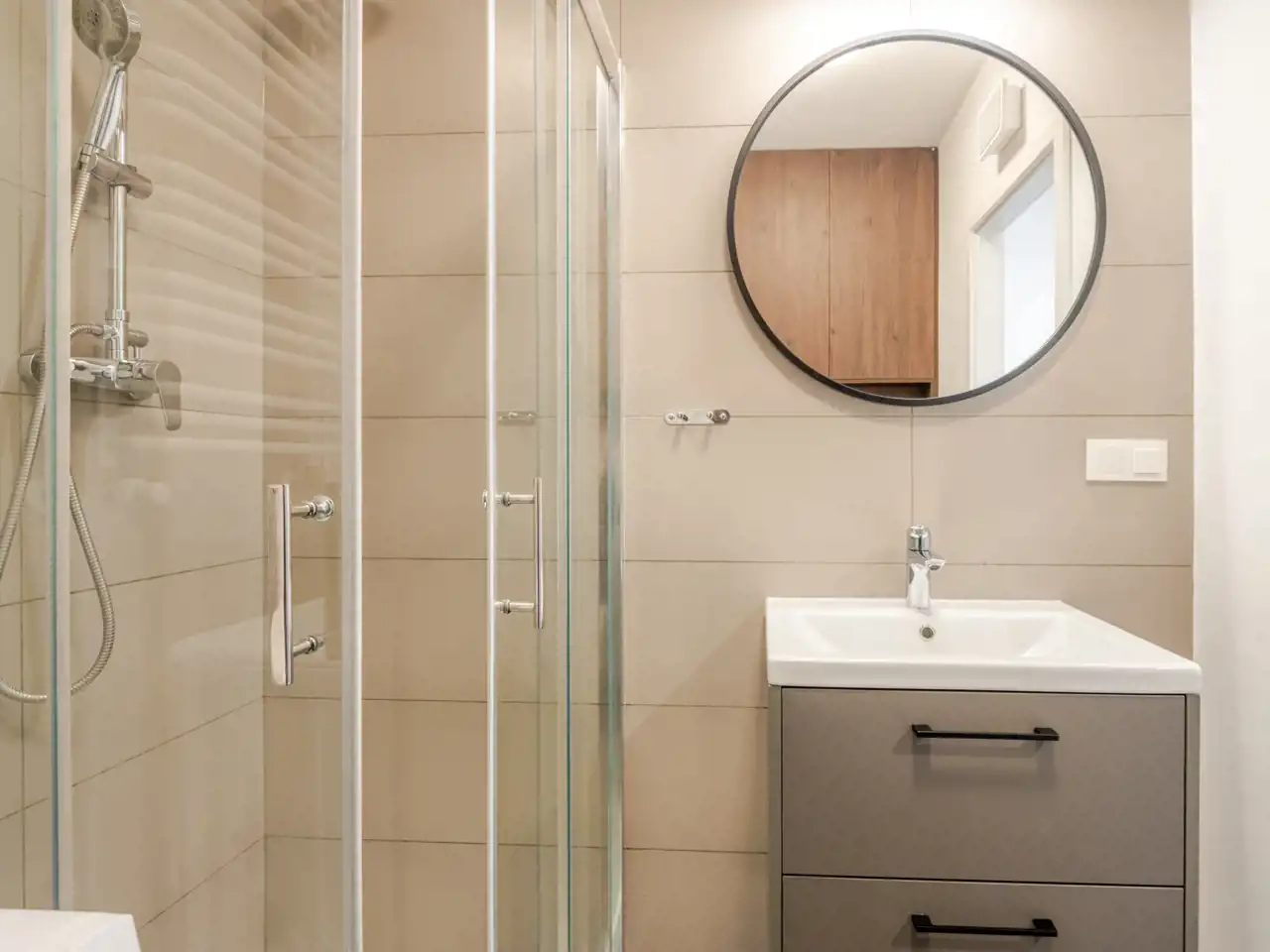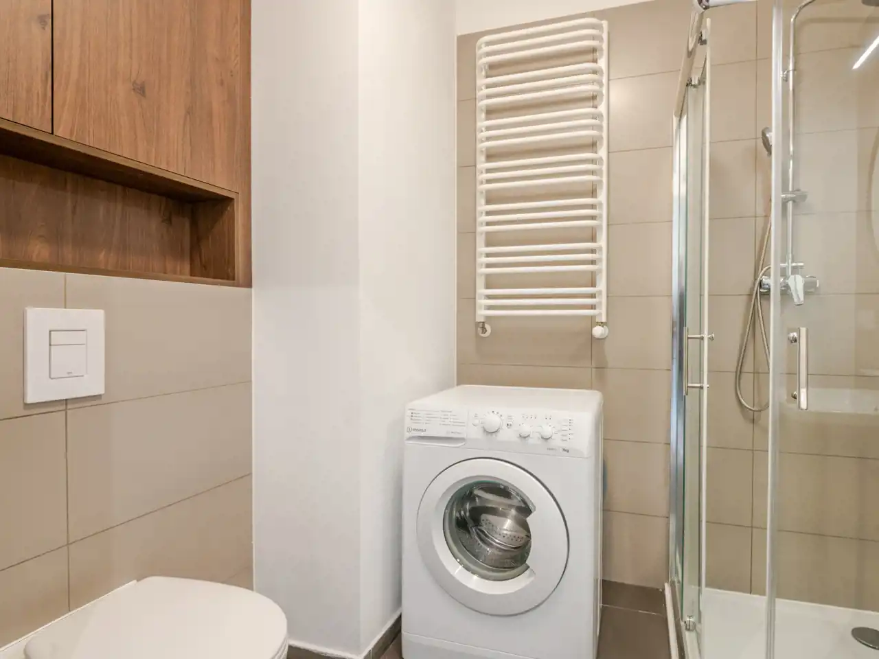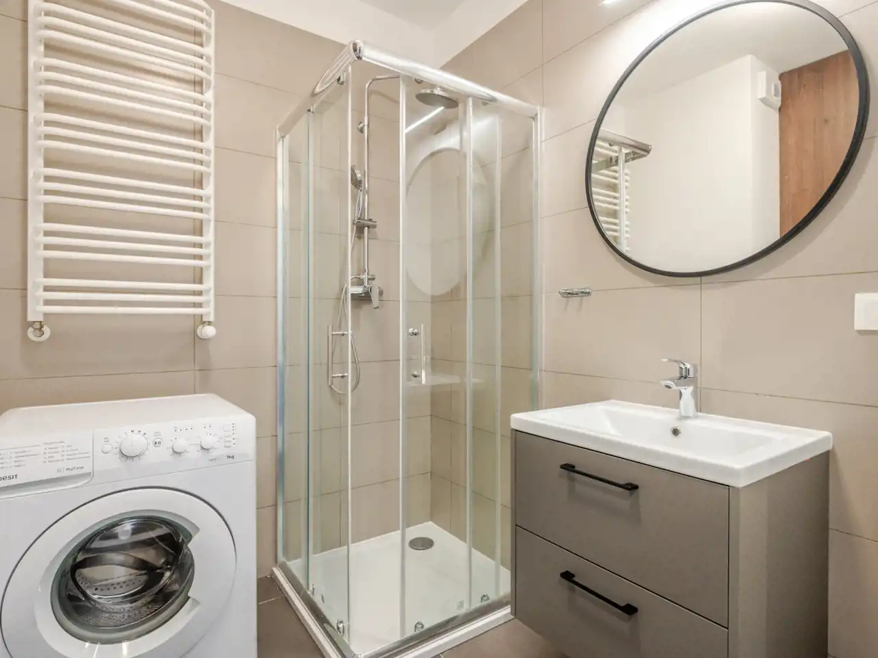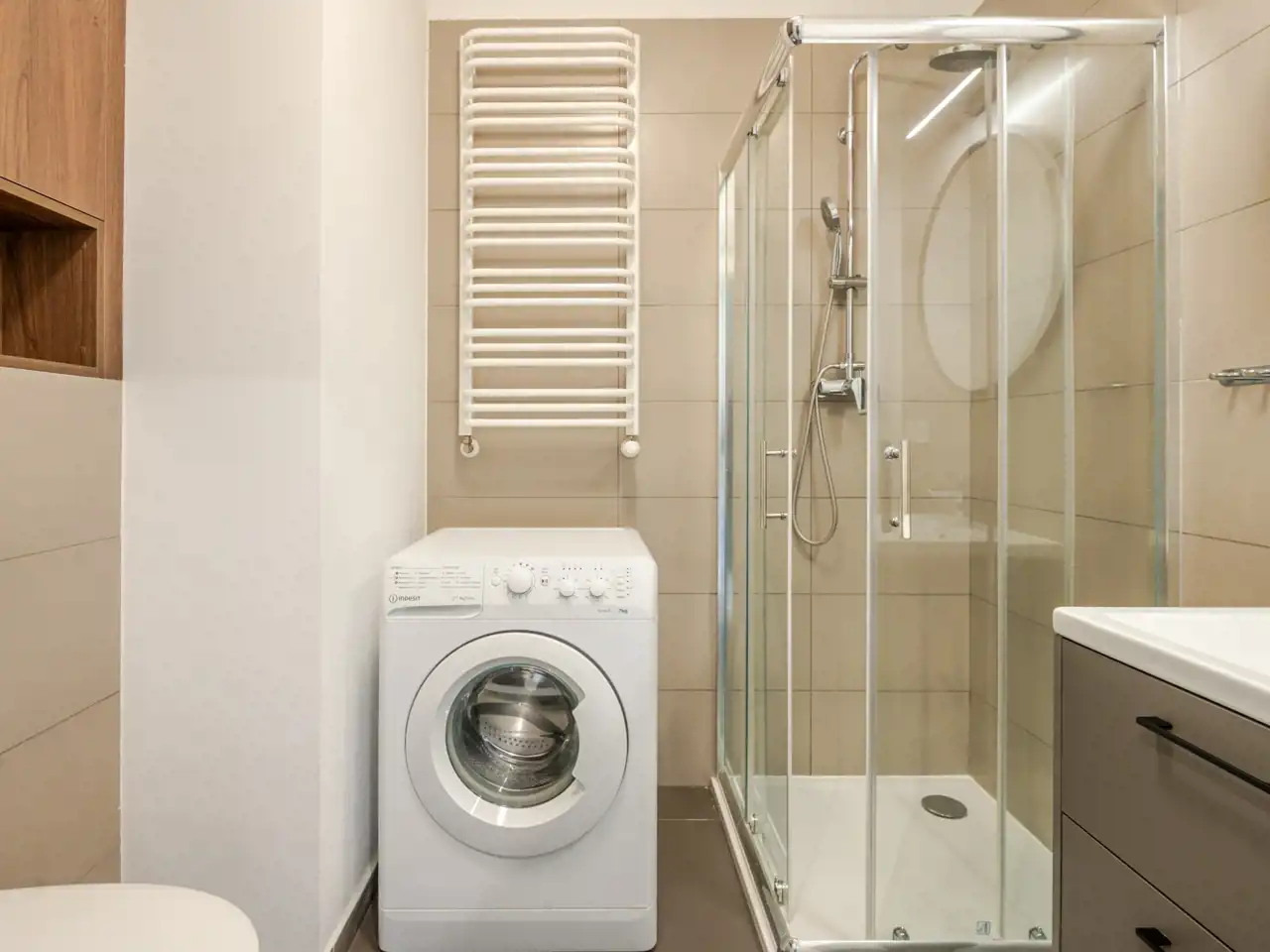 łazienkę z prysznicem, pralką, szafką pod umywalką i półkami na kosmetyki.