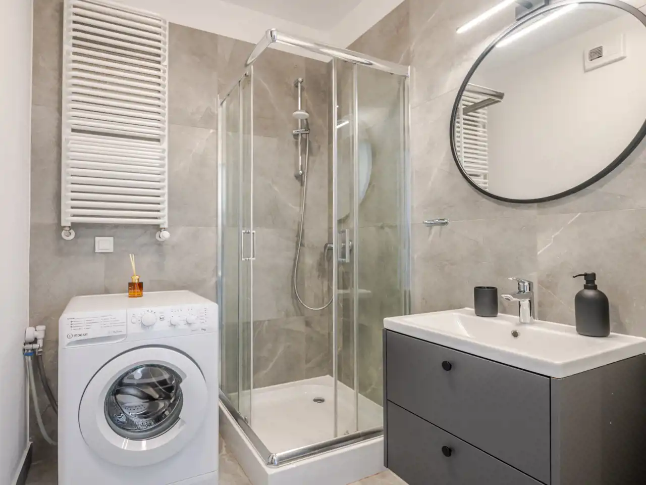 Łazienka: prysznic, pralka, szafka pod umywalką oraz szafka wisząca.