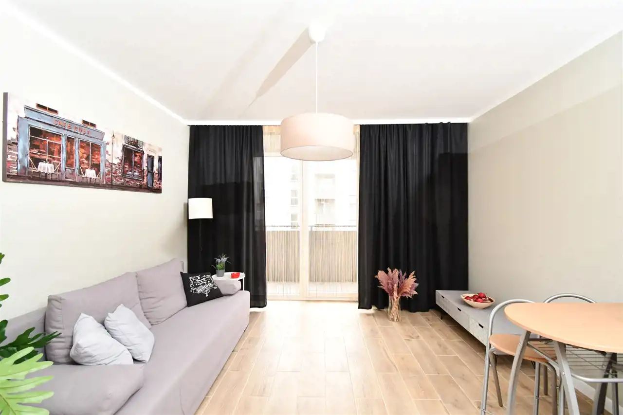 jasny i ustawny pokój dzienny z aneksem kuchennym oraz wyjściem na przestronny balkon,