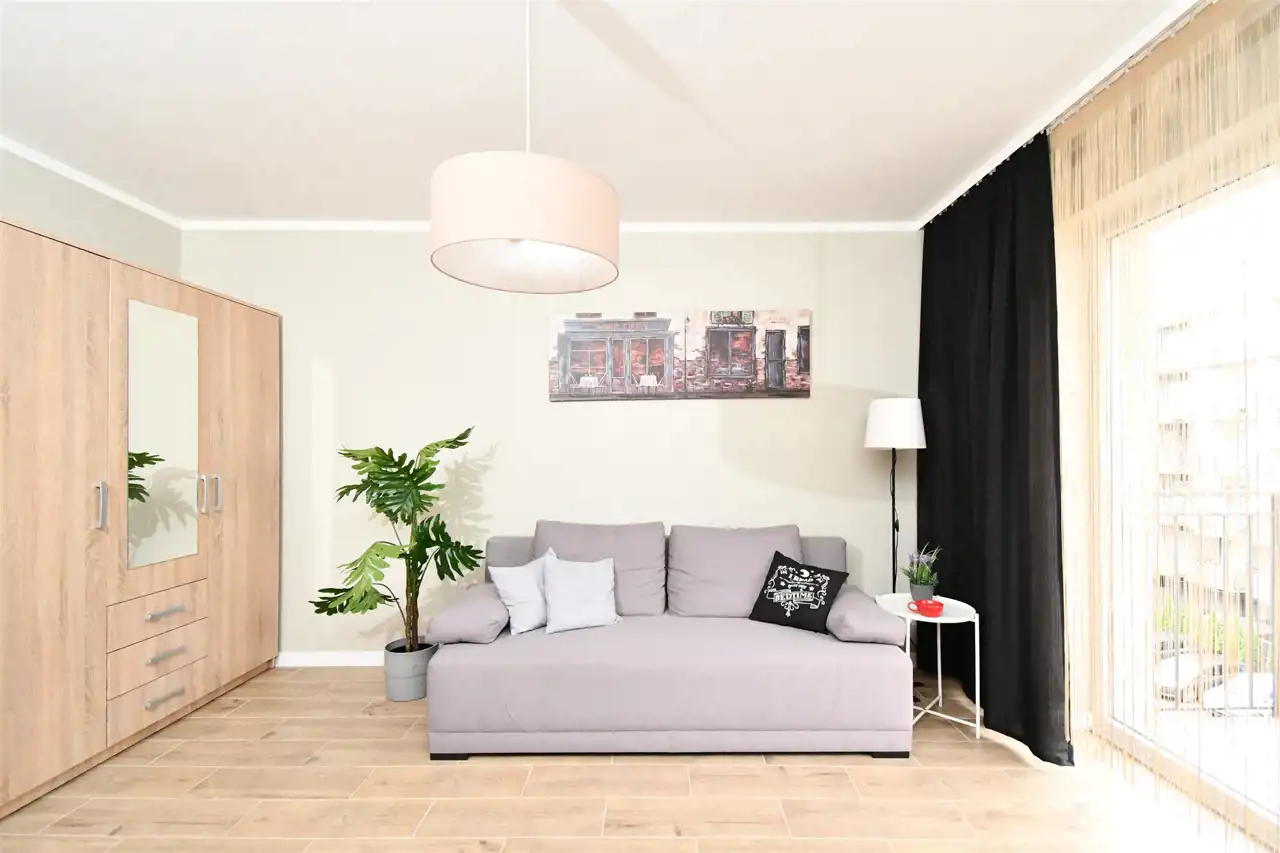 Lokal jest w pełni umeblowany i wyposażony w niezbędne sprzęty AGD (m.in. piekarnik, pralkę), dzięki czemu gotowy jest do zamieszkania od zaraz.