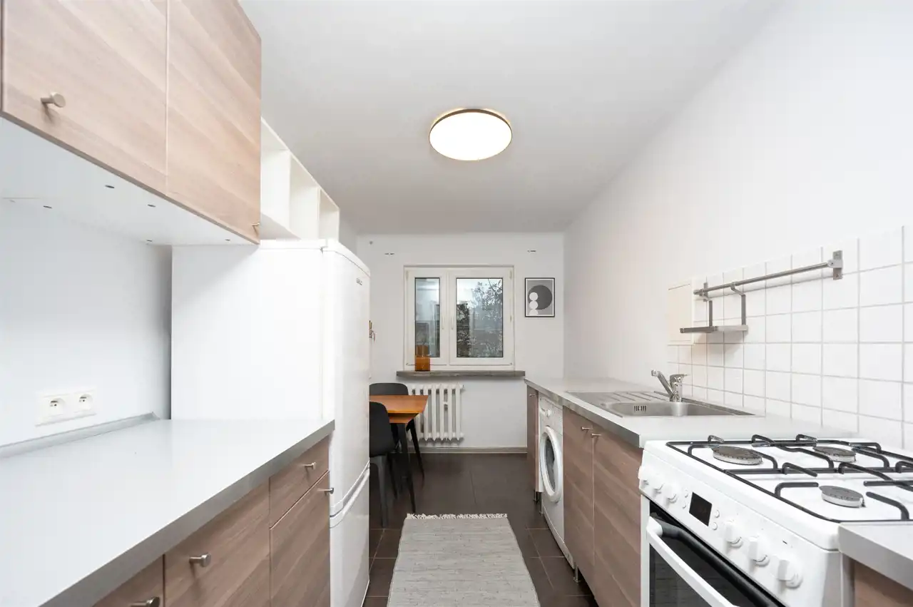 Kuchni, jasnej umeblowanej i wyposażonej (w: kuchenkę z piekarnikiem, lodówkę z zamrażarką, pralkę), są meble kuchenne na wymiar - jest też kącik jadalniany