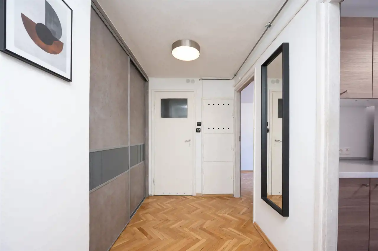 Sporego przedpokoju, z ładnym parkietem i dużą szafą w zabudowie.