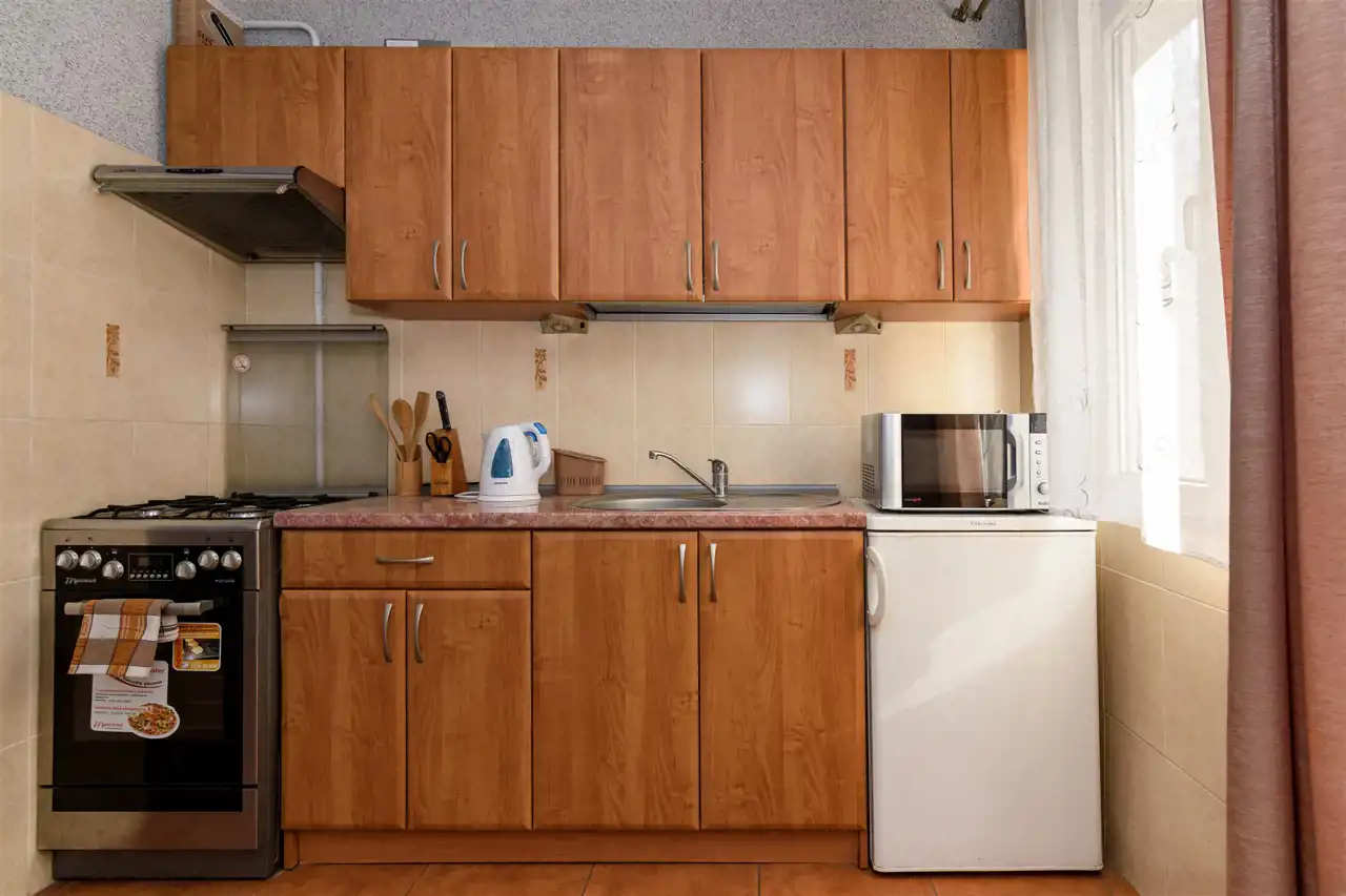 Living room with kitchenette and sleeping area: kitchen units, fridge, cooker with oven, extractor hood, microwave, kettle, table with chairs, new bed, RTV cabinet, TV, built-in wardrobe.