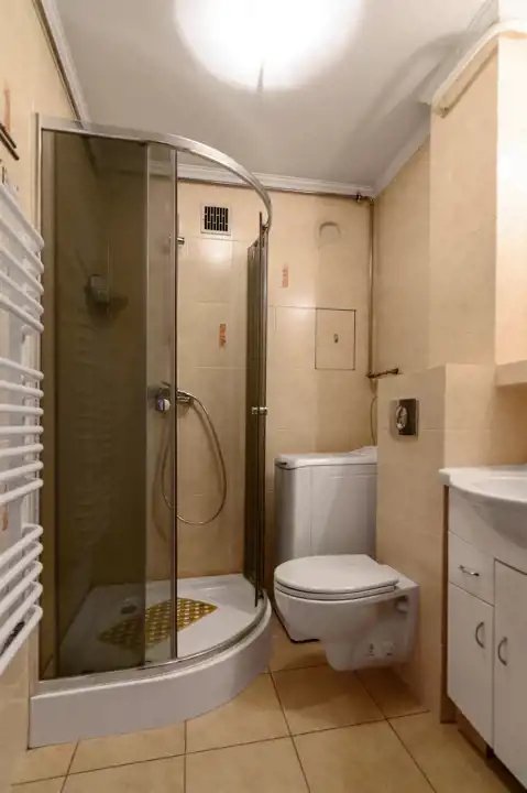 - Łazienka: prysznic, toaleta, umywalka, szafki łazienkowe, lustro, pralka.
