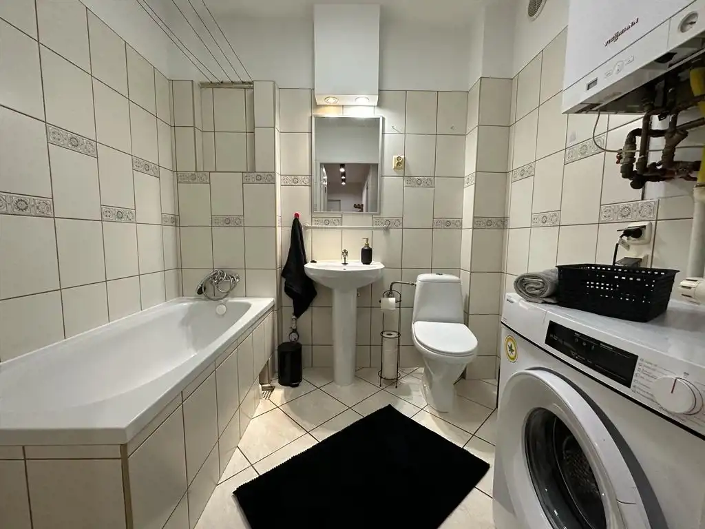 - Łazienki wyposażonej w wannę z prysznicem oraz pralkę.
