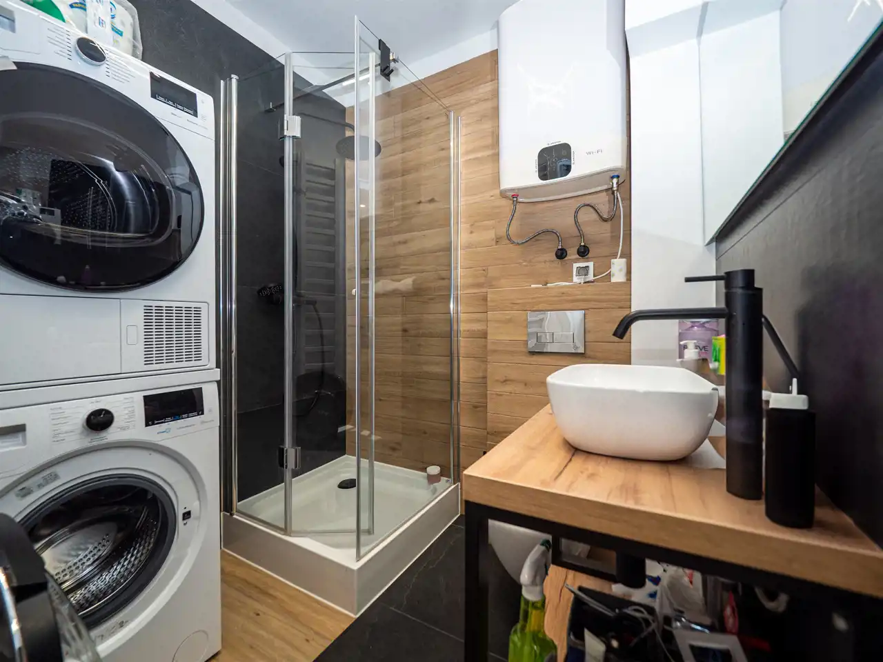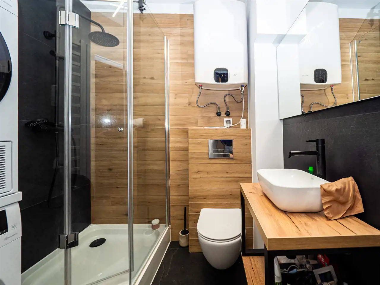 Łazienka z kabiną prysznicową, pralką i suszarką, dużym lustrem i efektownym oświetleniem.