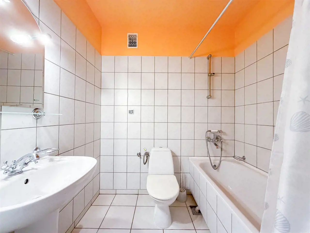 Łazienka z wanną, wc, umywalką oraz lustrem.