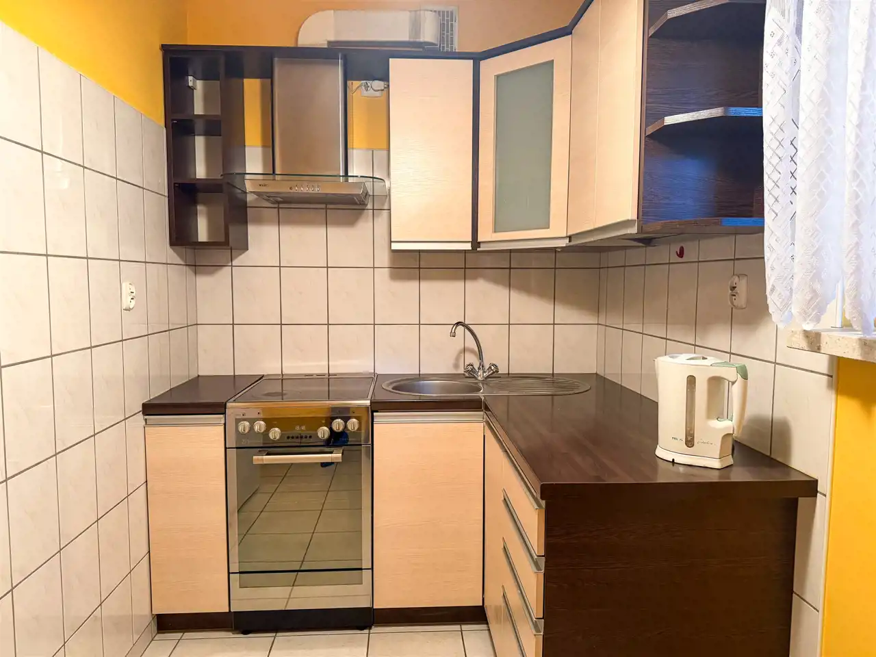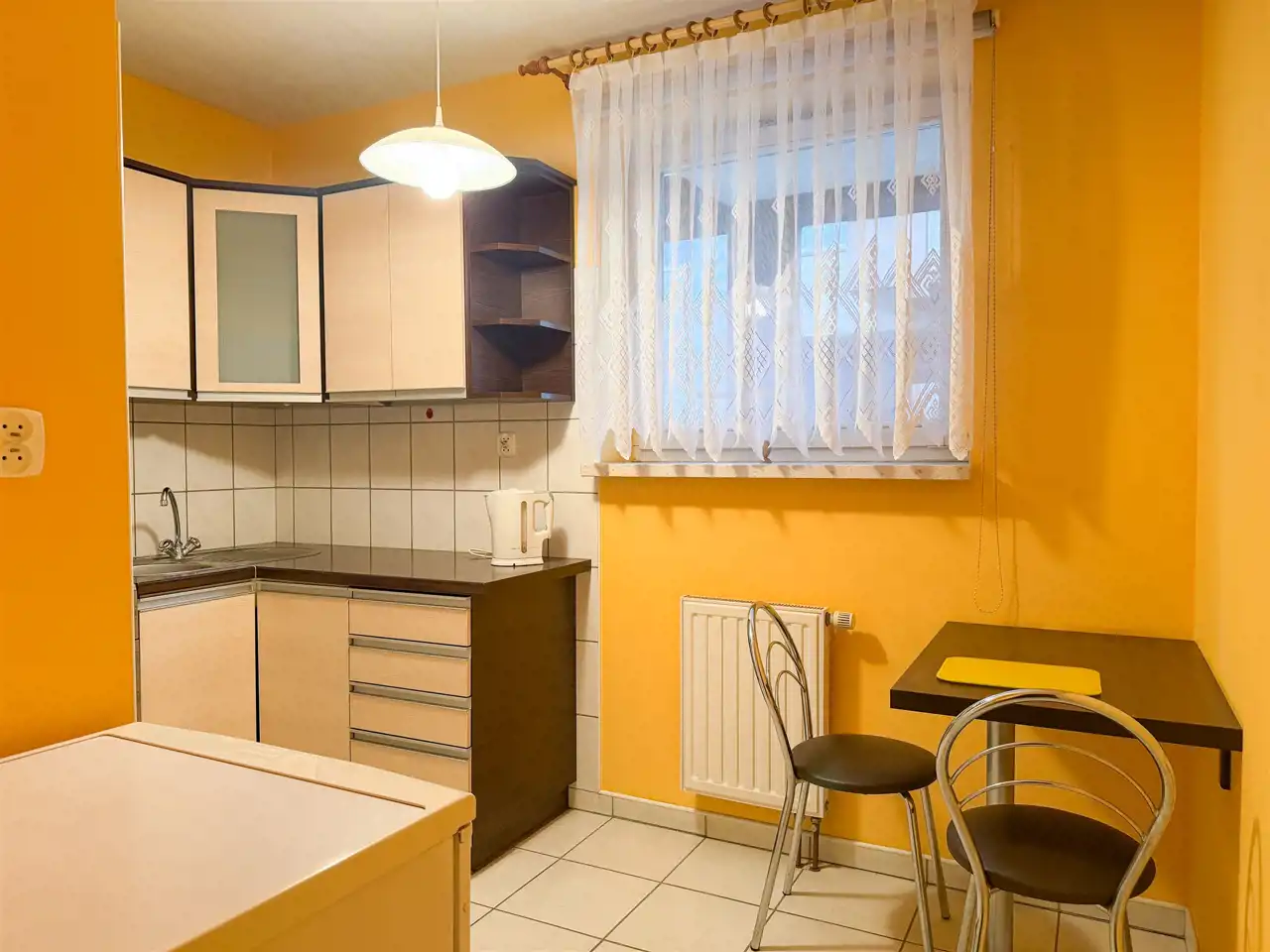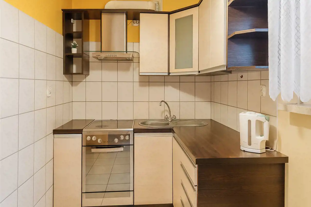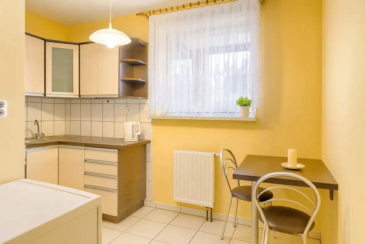 Oddzielna, jasna kuchnia o powierzchni około 6 m2 z lodówką, piekarnikiem, płytą elektryczną, stołem oraz dwoma krzesłami.