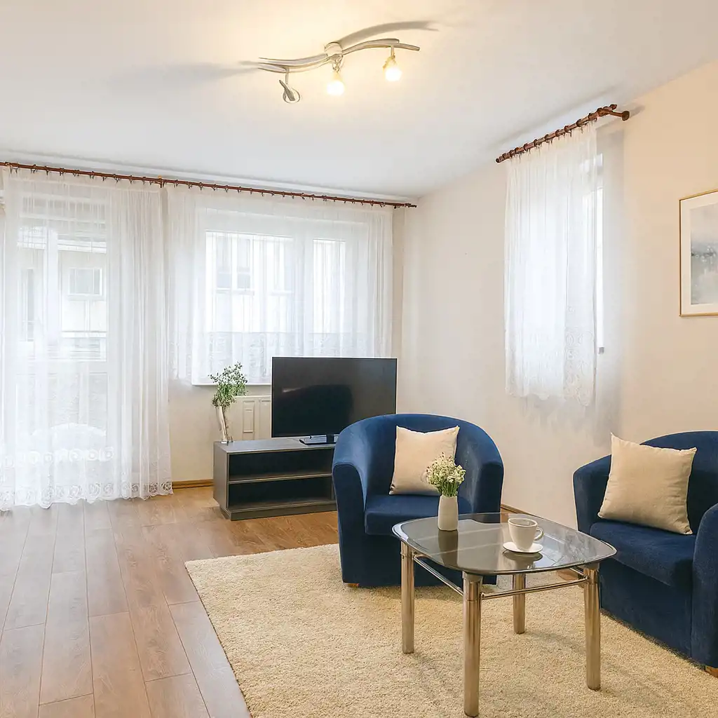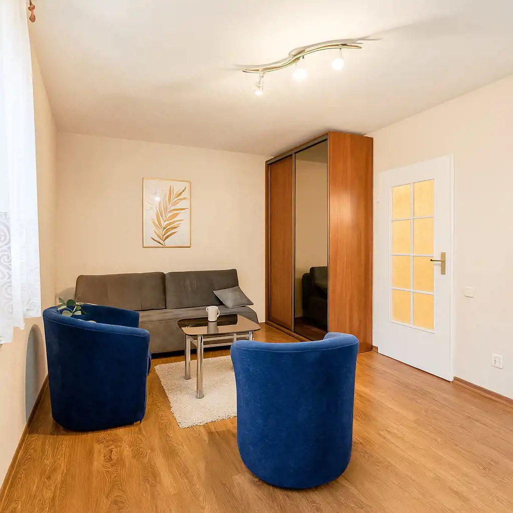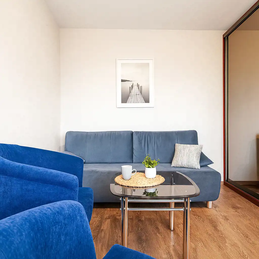 Pokój o powierzchni około 17 m2 z rozkładaną sofą, stolikiem, dwoma fotelami, szafą, stolikiem RTV oraz telewizorem. Z pokoju jest wyjście na duży balkon o powierzchni około 5m2, z ekspozycją południowo-wschodnią.