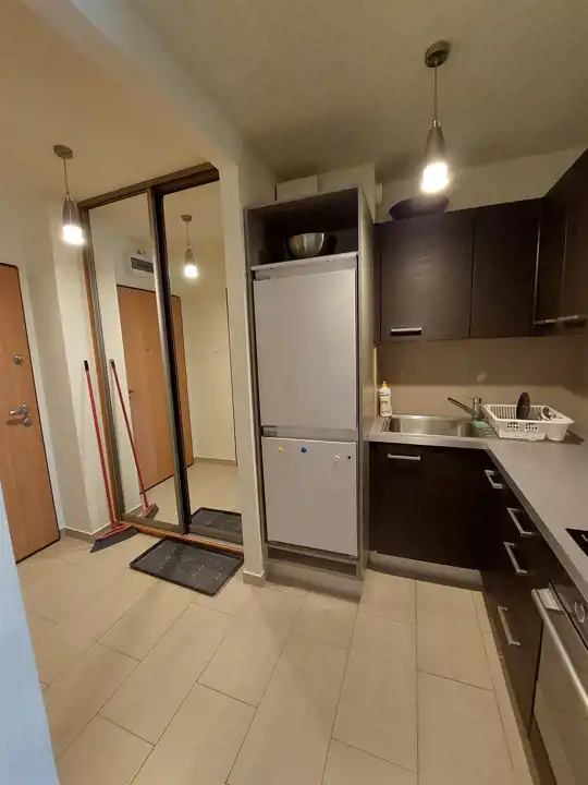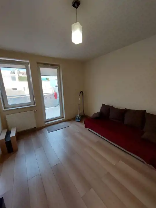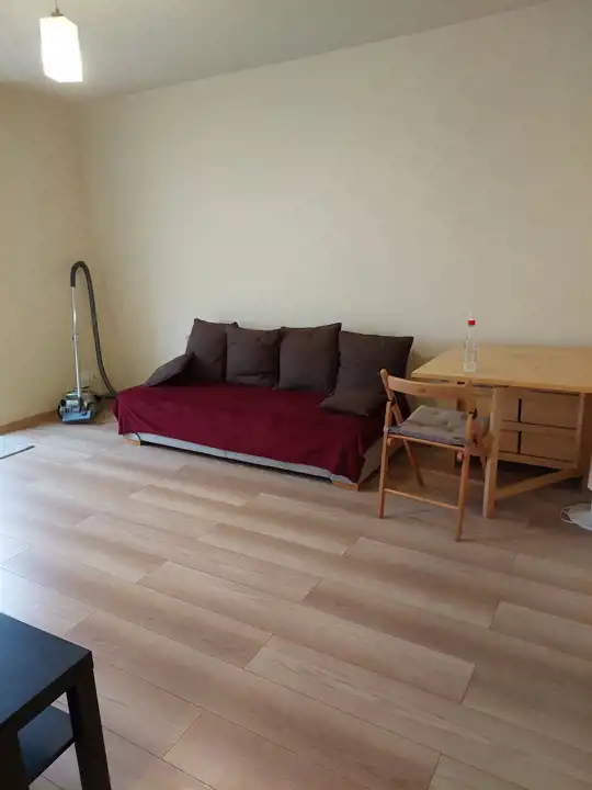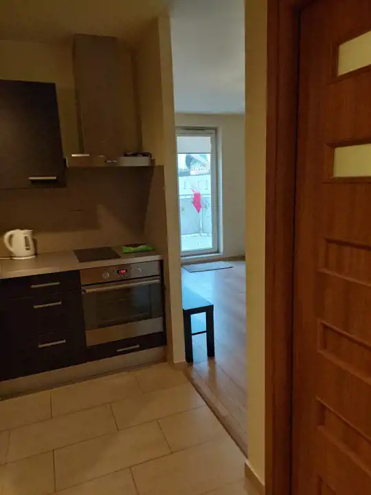 Jasna, ustawna, umeblowana i wyposażona w podstawowe sprzęty z aneksem kuchennym i wydzieloną częścią sypialnianą (łóżko dwuosobowe, sofa, lodówka, płyta elektryczna, piekarnik, wanna, odkurzacz, wyposażenie drobne).