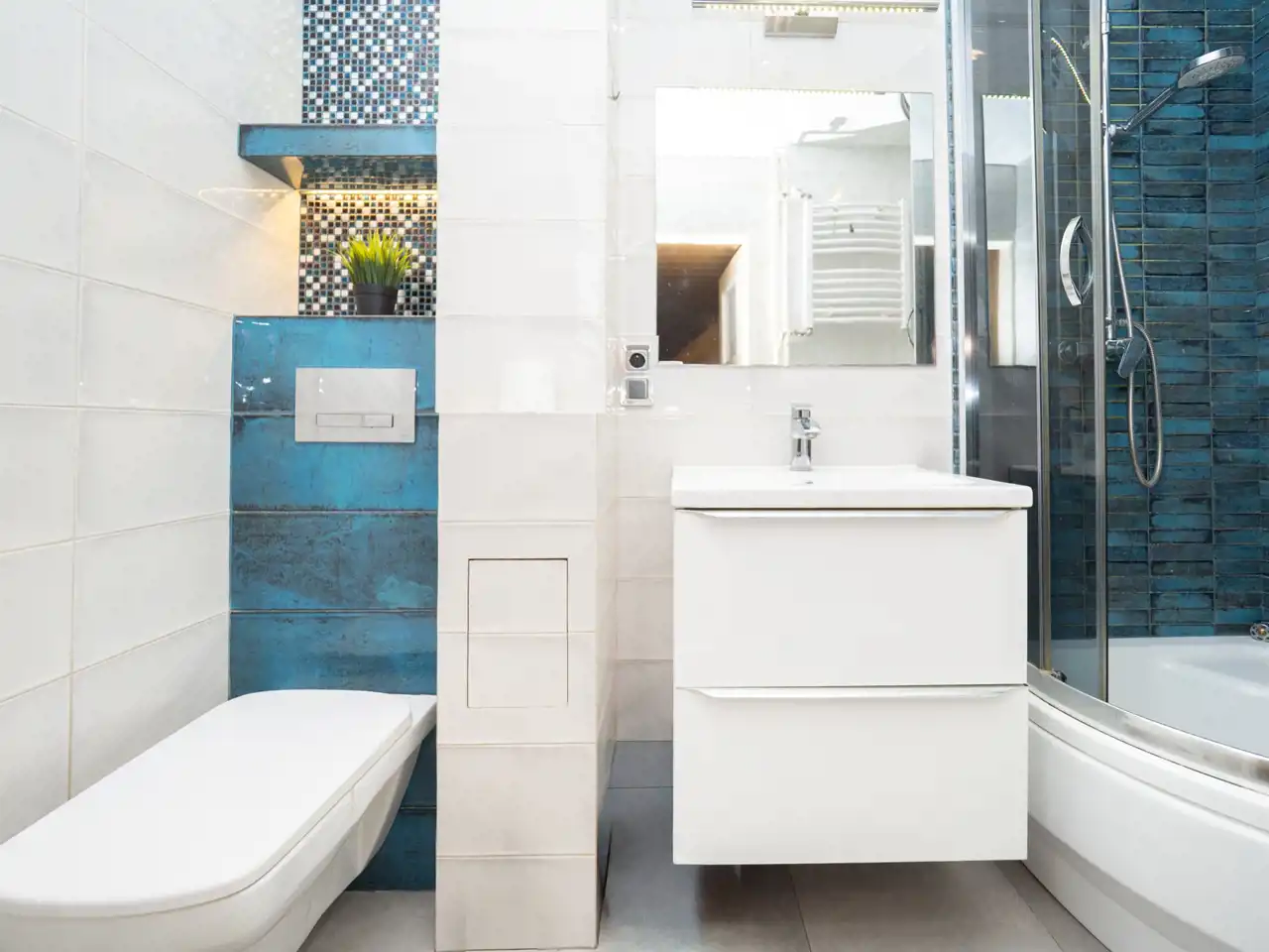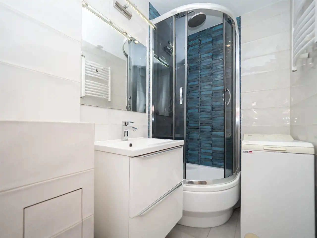- a bathroom with a shower and a washing machine,