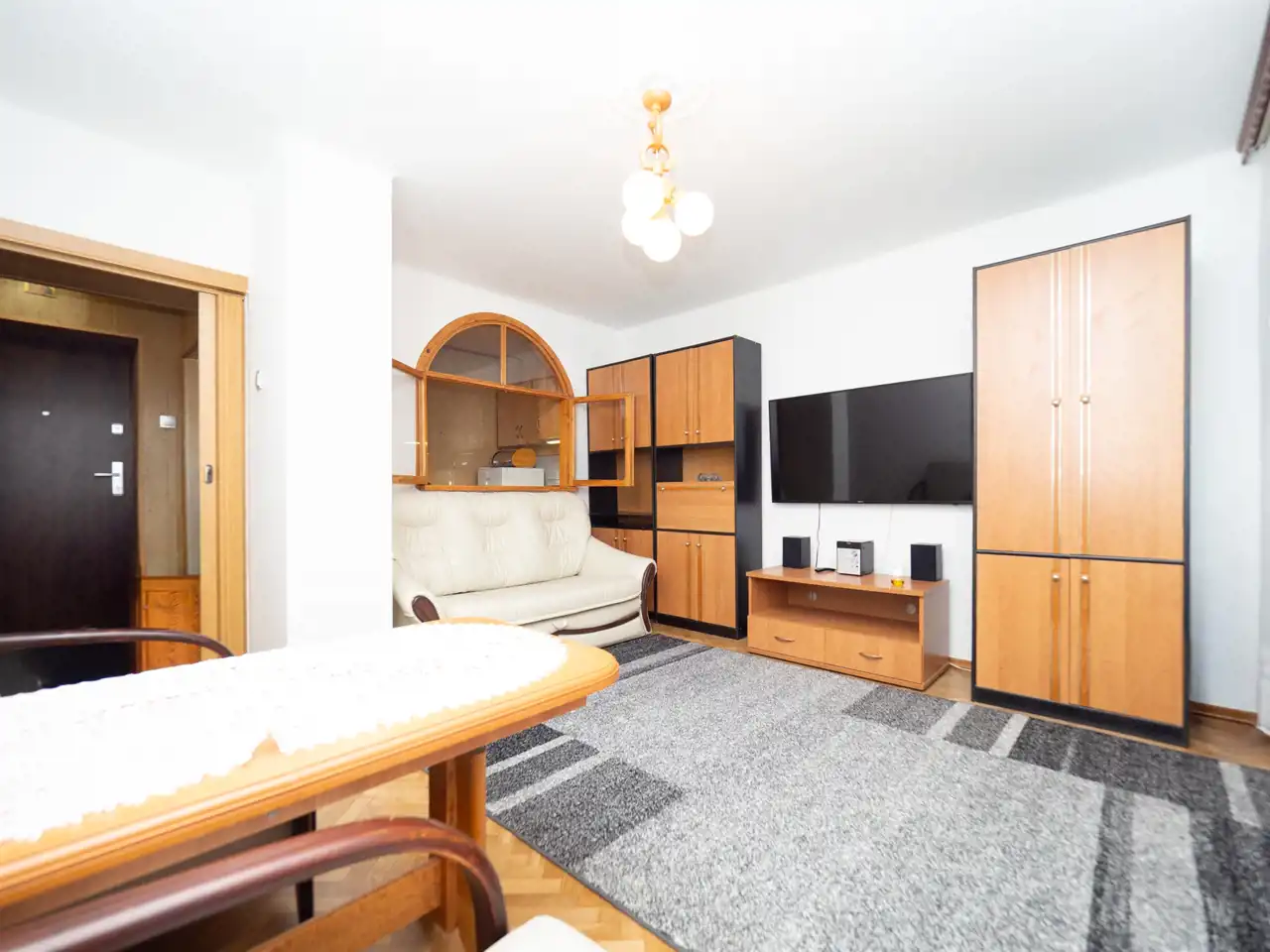 - a living room with a fold-out sofa, armchairs, cabinets, a 55” TV, and a French balcony,