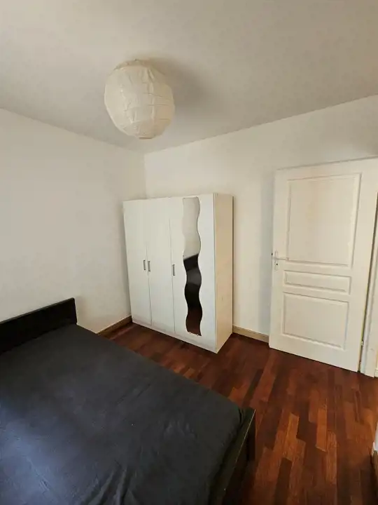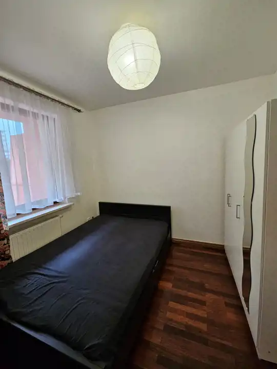 Dwa pokoje z aneksem kuchennym, częściowo umeblowane (łóżko, komoda, szafa).
