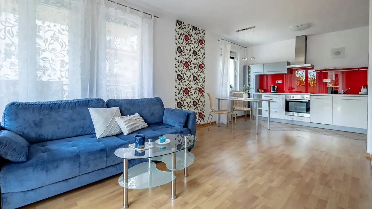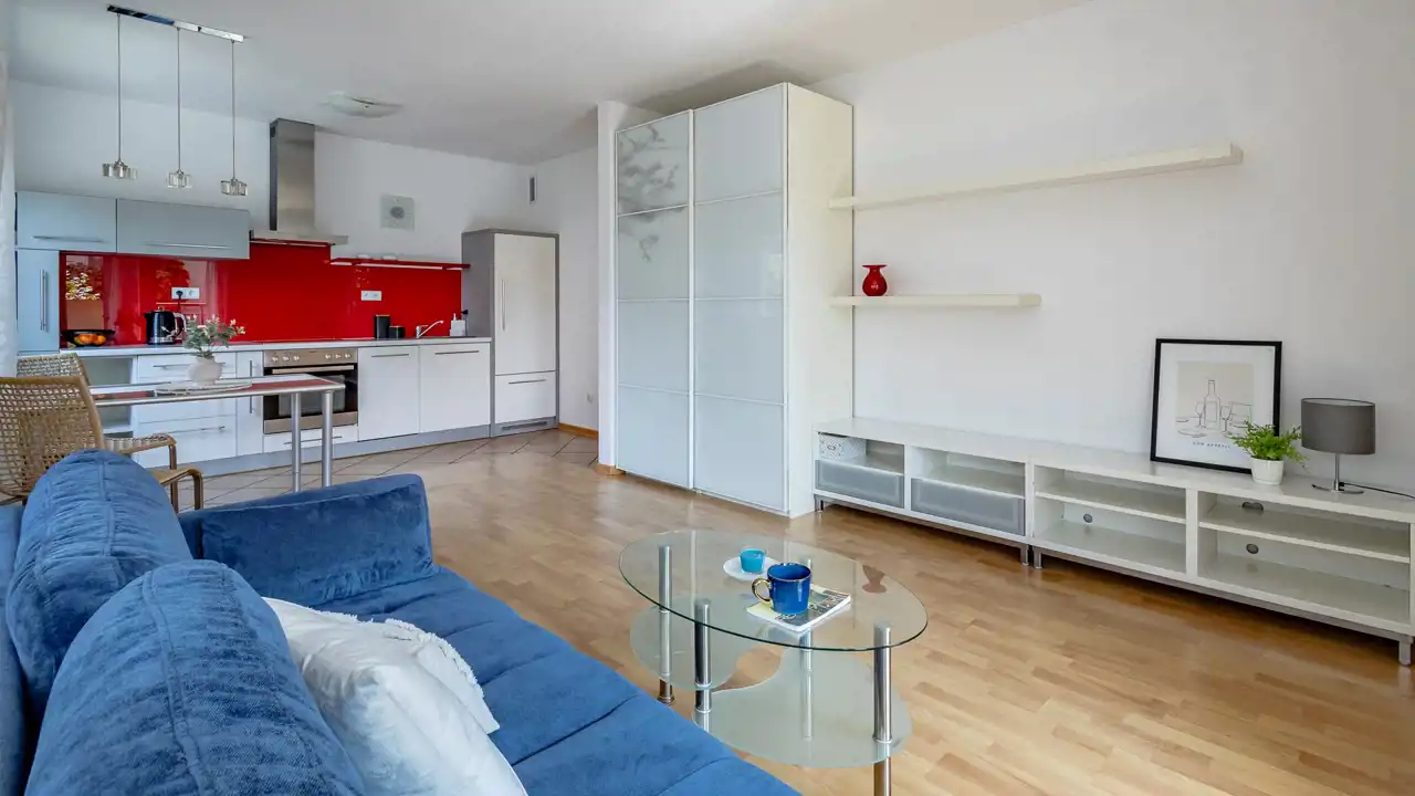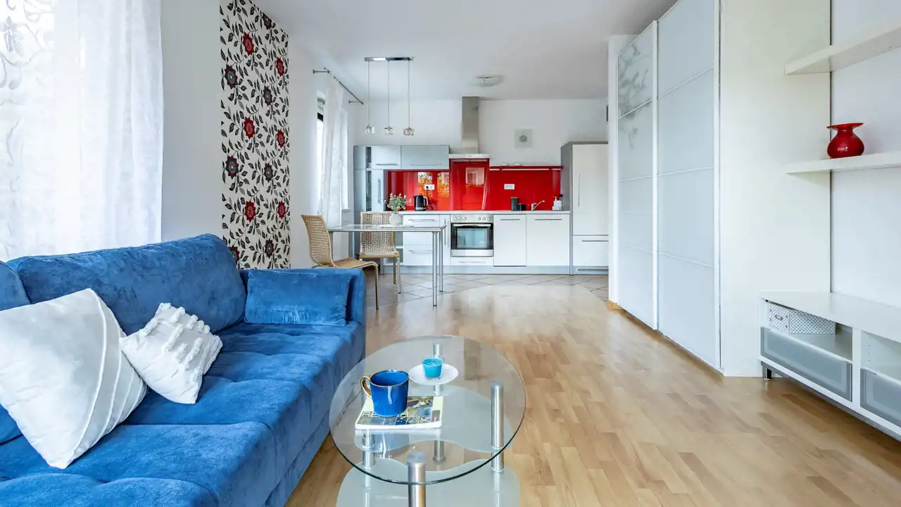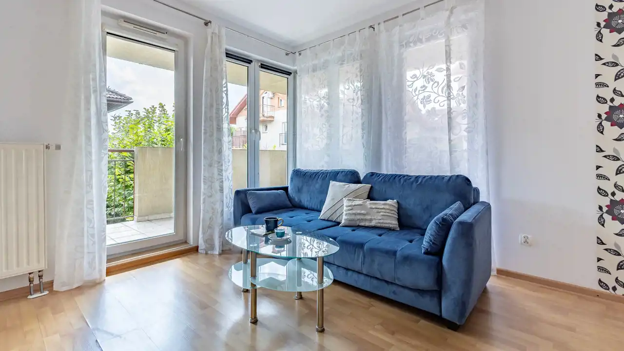 Komfortowa strefa dzienna z rozkładaną sofą, stolikiem kawowym oraz pojemną szafą.