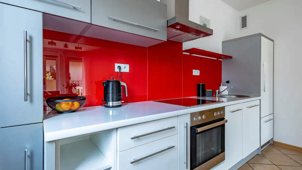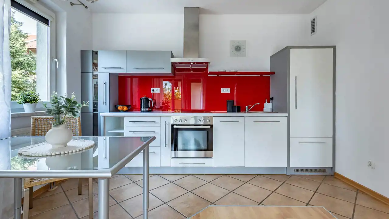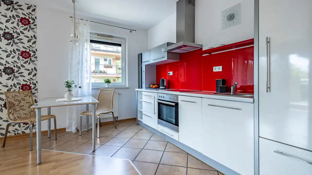 W części kuchennej nowoczesna zabudowa wyposażona w niezbędny sprzęt AGD (lodówka, zmywarka, płyta indukcyjna, piekarnik, okap) oraz niezbędne akcesoria kuchenne (naczynia, garnki, kubki, sztućce itp.) i wygodny stół z krzesłami.