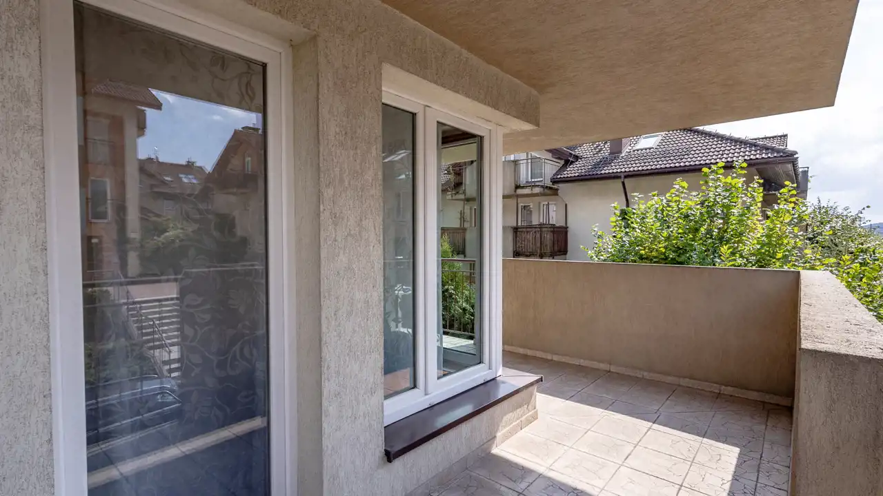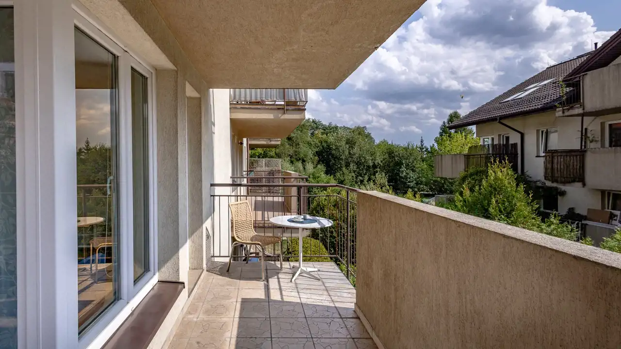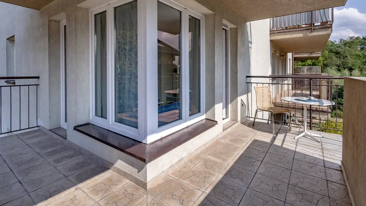 Duży, słoneczny taras z miejscem na wypoczynek i kawę na świeżym powietrzu.