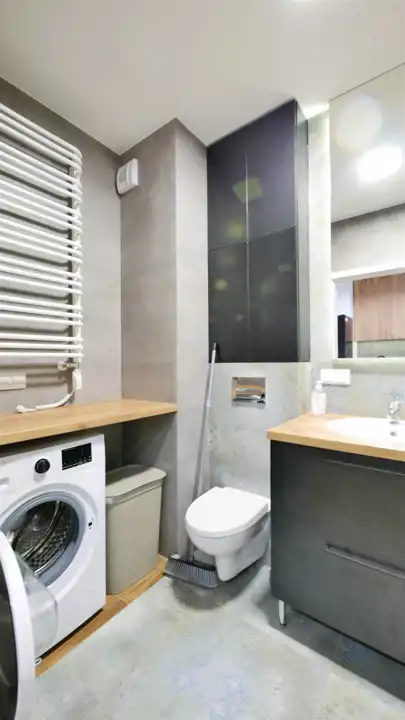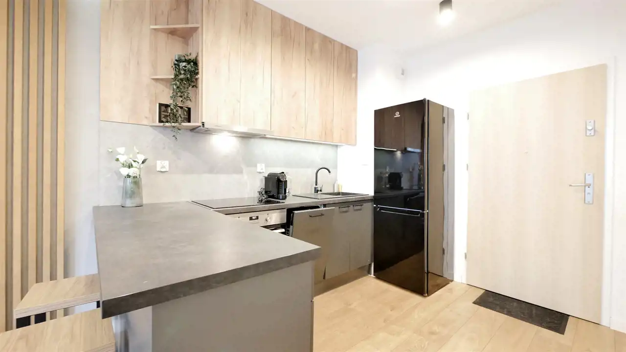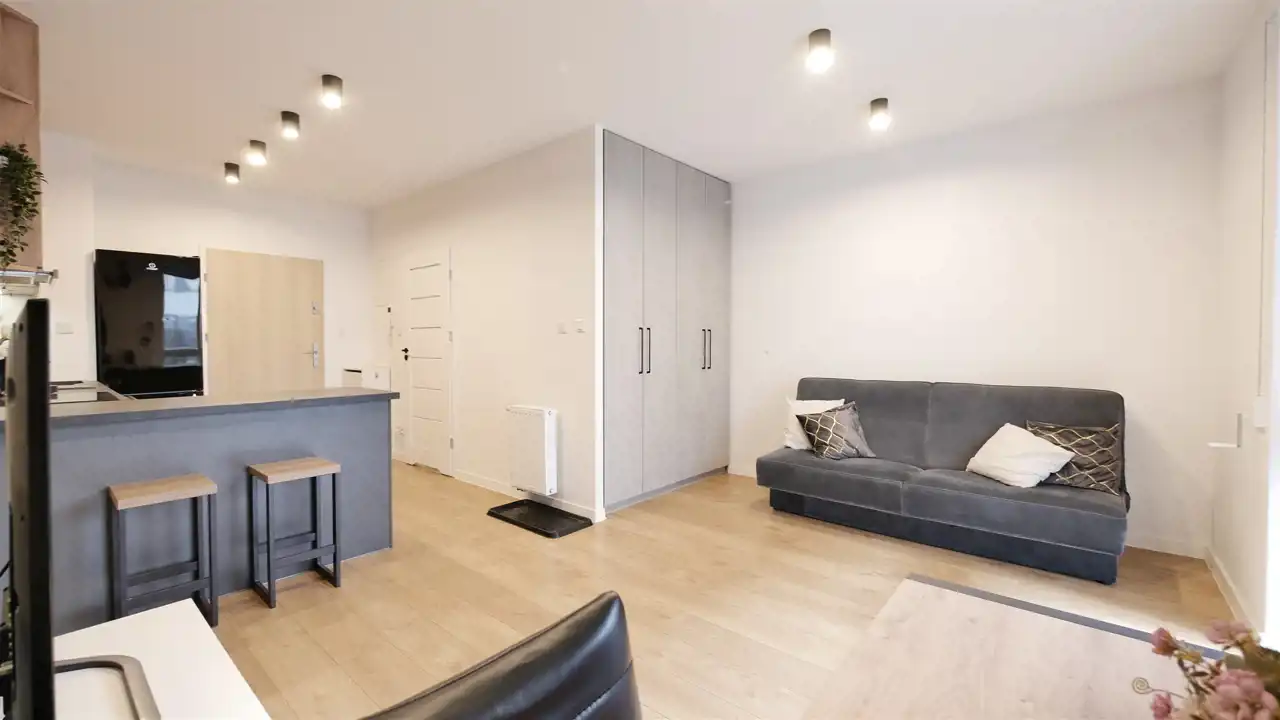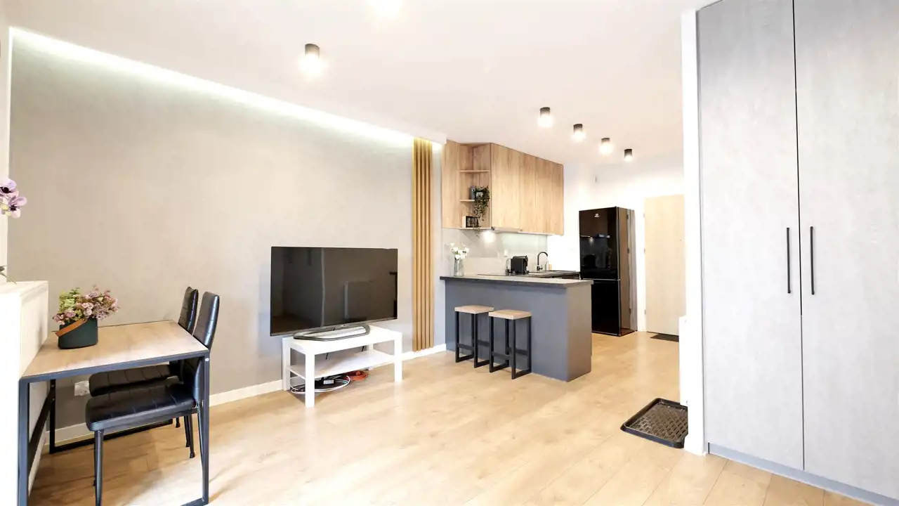 Układ pomieszczeń: Składa się z pokoju z aneksem kuchennym, łazienki i przedpokoju. W części dziennej stoi rozkładana kanapa, stolik i komoda TV i szafa. Aneks kuchenny posiada meble na wymiar i sprzęt AGD w zabudowie (płyta, piekarnik, okap, lodówka z zamrażalnikiem, zmywarka).W łazience znajduje się prysznic, umywalka z szafką, pralka. Na podłogach w pokoju położono panele, w pozostałych pomieszczeniach i części z aneksem - płytki. Z pokoju dziennego wyjście na własny taras/ogródek. Ogrzewanie jest centralne, dla budynku.