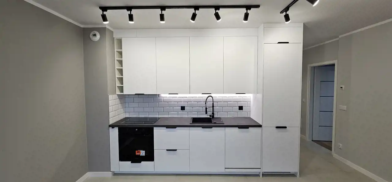 - salon połączony z kuchnią, wyposażoną w meble na wymiar i nowy sprzęt AGD (płyta indukcyjna, piekarnik, okap, lodówko-zamrażarka, zmywarka)