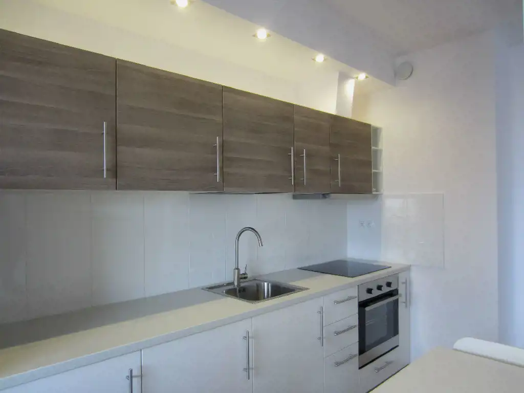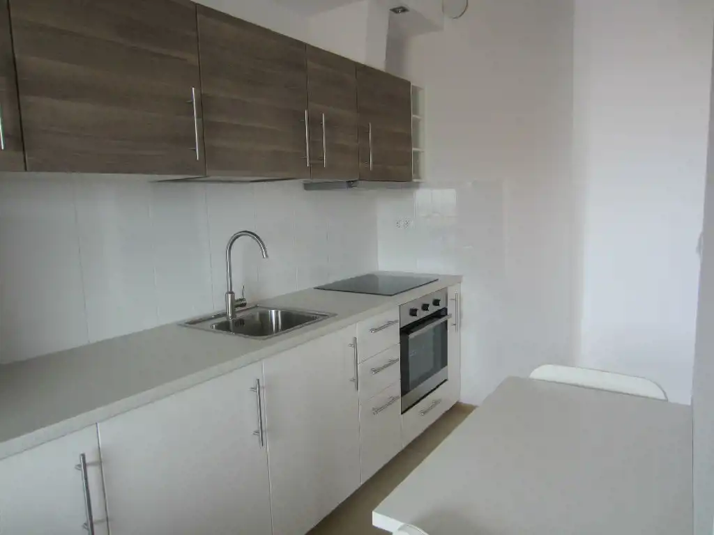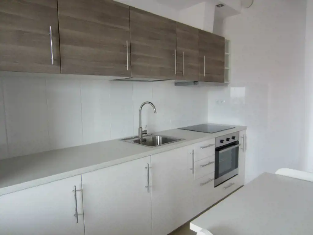 W kuchni zestaw szafek kuchennych, lodówko-zamrażarka, płyta elektryczna, piekarnik elektryczny.