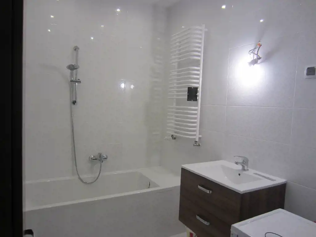 W łazience wyważone jasne flizy, wanna, pralka Whirpool.