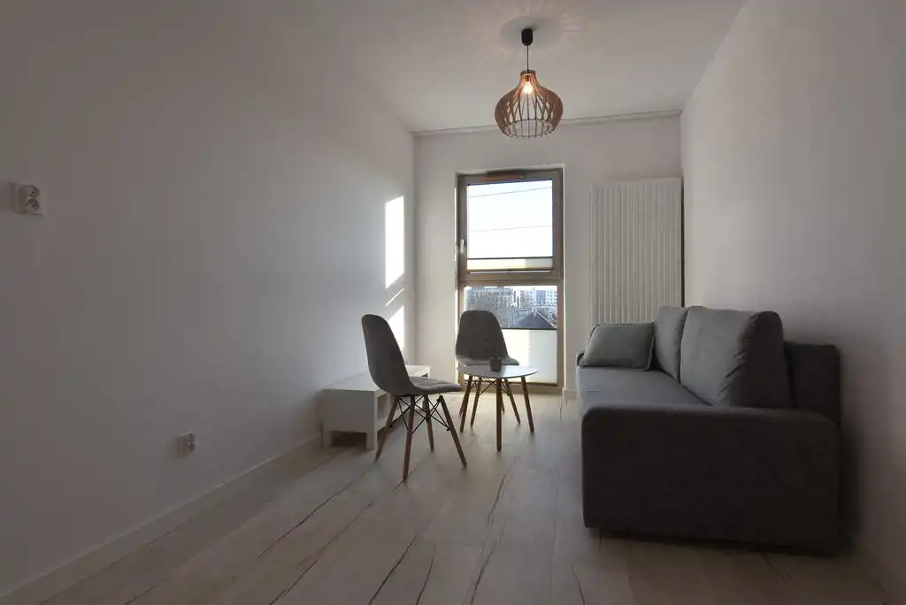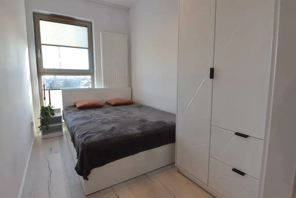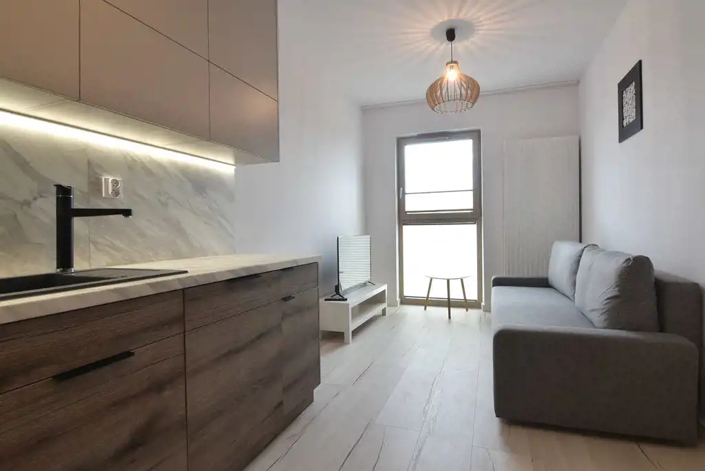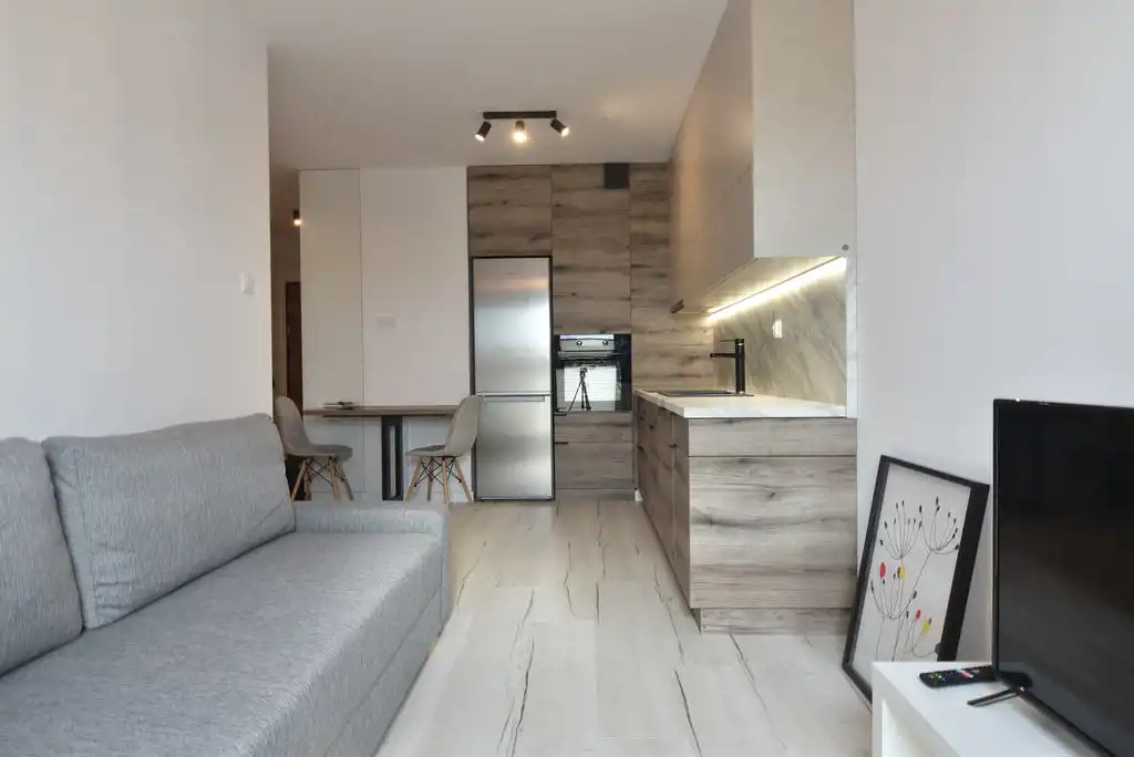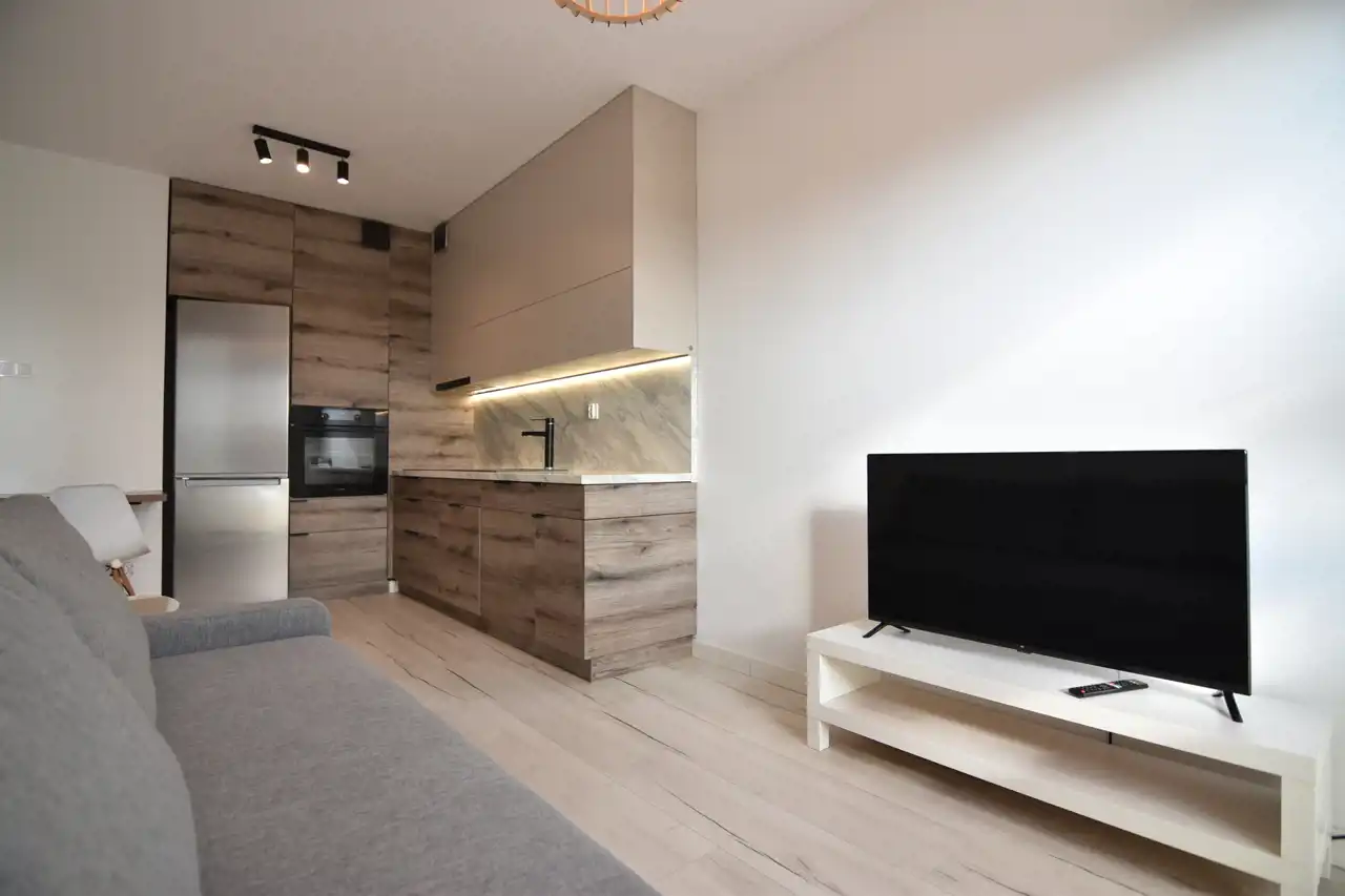 Mieszkanie w pełni umeblowane i wyposażone. Meble w zabudowie, lodówka, płyta indukcyjna, piekarnik, okap, pralka w zabudowie oraz LCD TV.