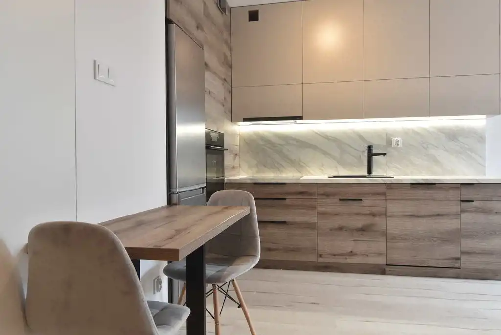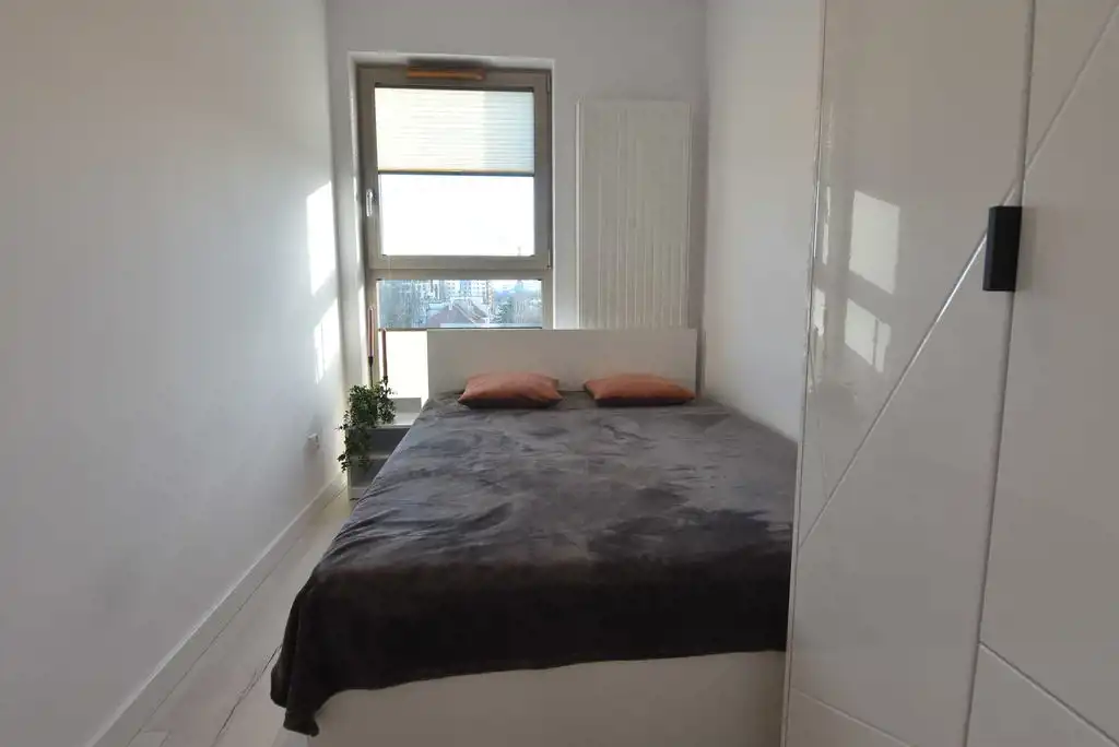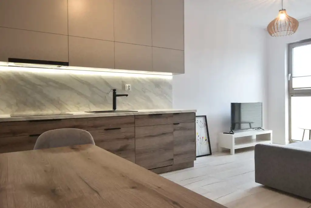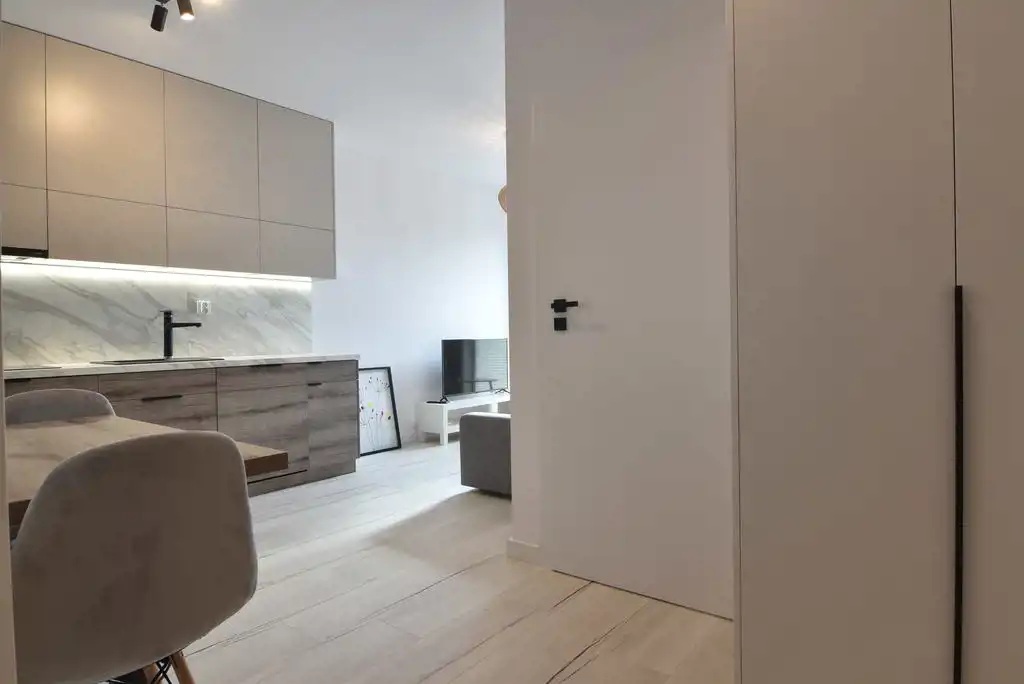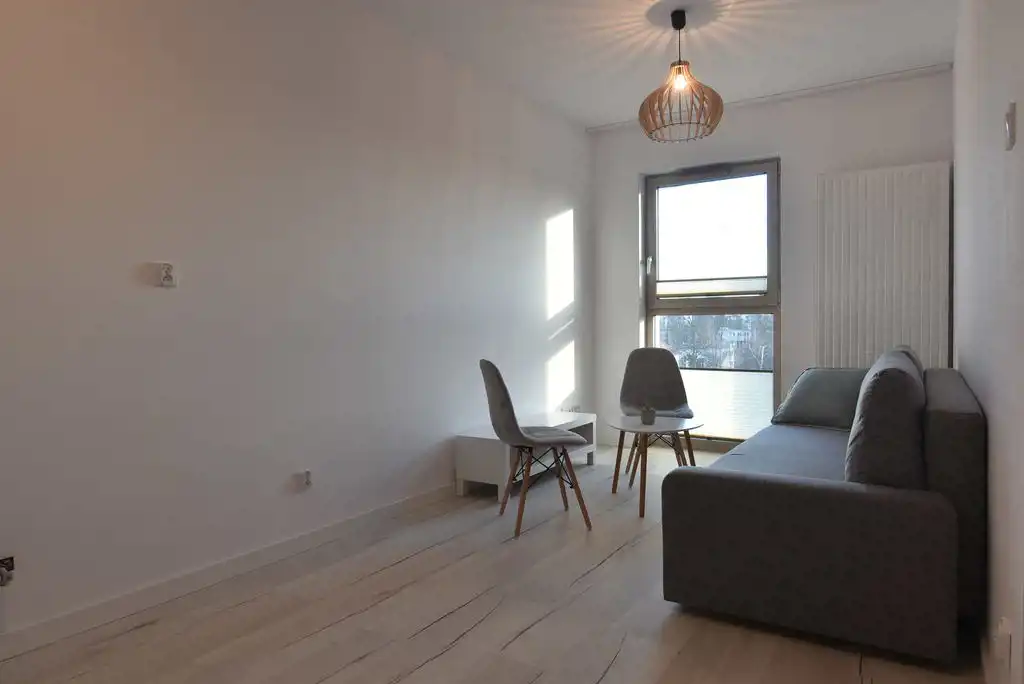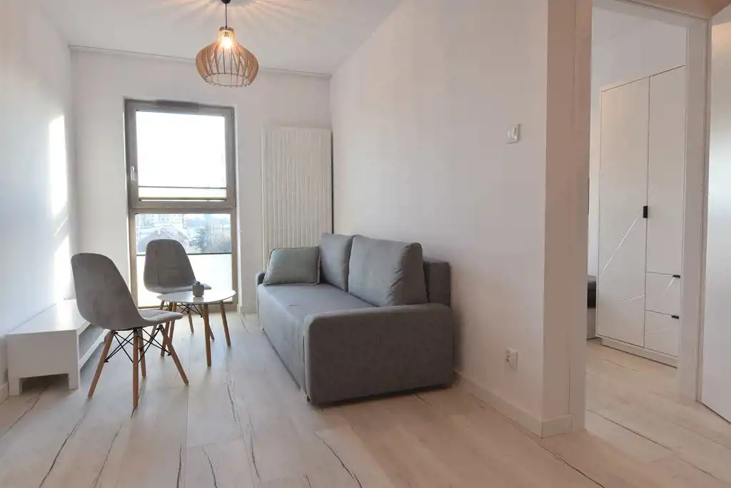 Mieszkanie w pełni umeblowane i wyposażone. Meble w zabudowie, lodówka, płyta indukcyjna, piekarnik, okap, pralka w zabudowie oraz LCD TV.