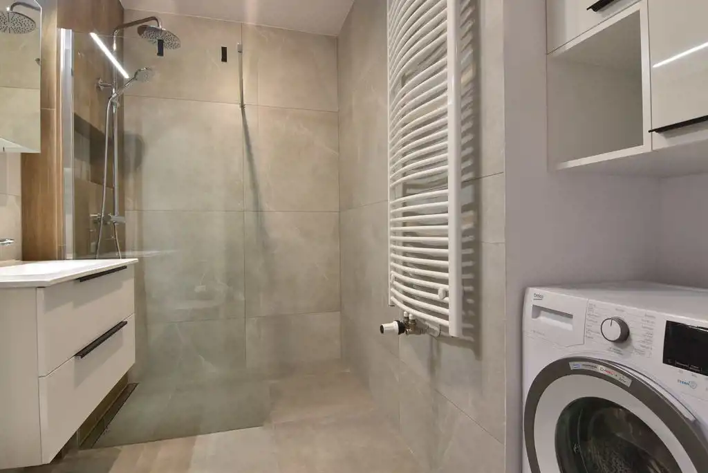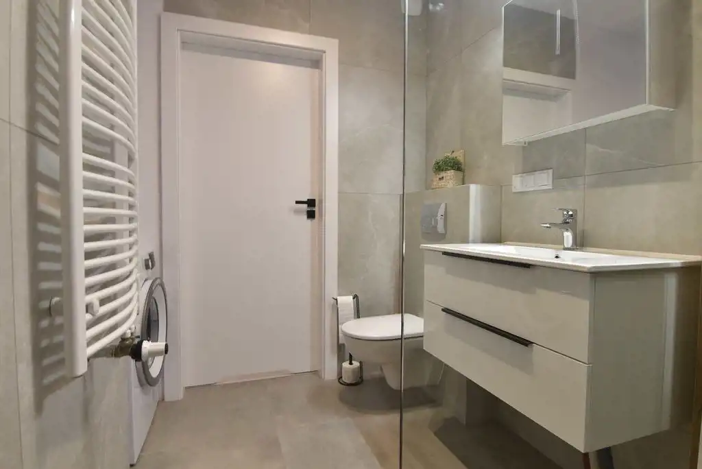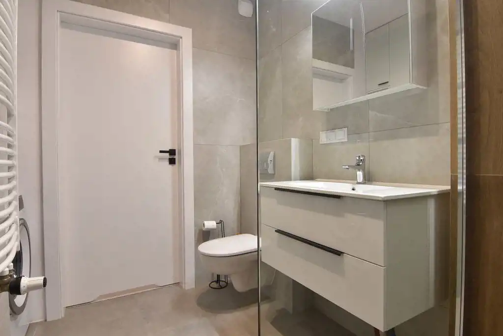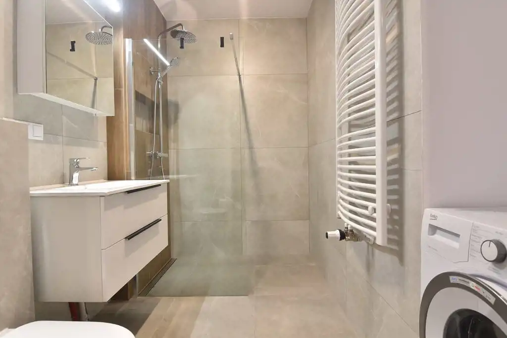 The apartment is fully furnished and equipped. Built-in furniture, fridge, induction hob, oven, hood, built-in washing machine and LCD TV.