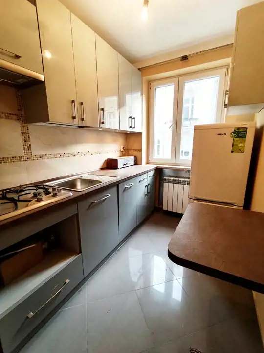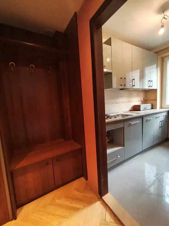 Kształt pokoju pozwala wydzielić w nim miejsce do spania, pracy i salon. Z pokoju wyjście na balkon. Kuchnia osobna, jasna z oknem, umeblowana, wyposażona w podstawowy sprzęt AGD (lodówko-zamrażarka, kuchenka, zmywarka, mikrofala, wszystkie sprzęty nowe). Łazienka połączona z wc, z prysznicem i pralką. Przedpokój z dużą zabudowaną szafą. Istnieje możliwość domeblowania na życzenie klienta.