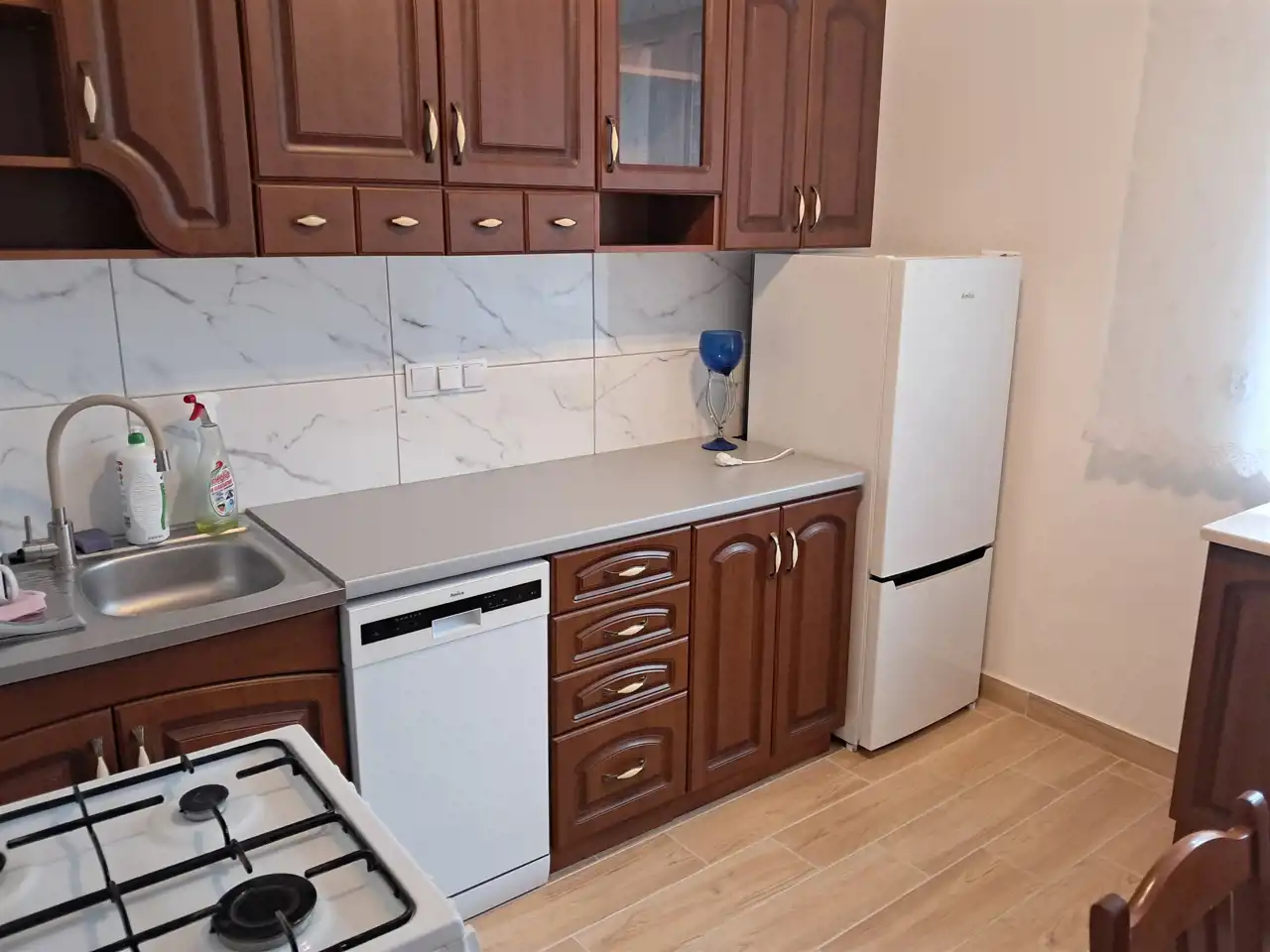 - odrębnej jasnej kuchni- wyposażonej w funkcjonalne szafki, nową lodówkę i zmywarkę, stół z krzesłami