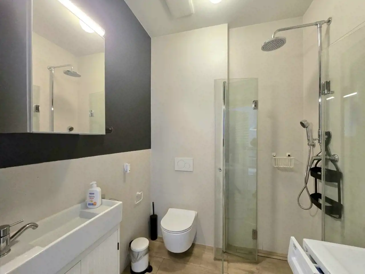 Łazienka: Nowoczesna, z kabiną prysznicową i pralką.