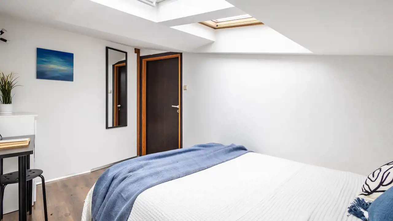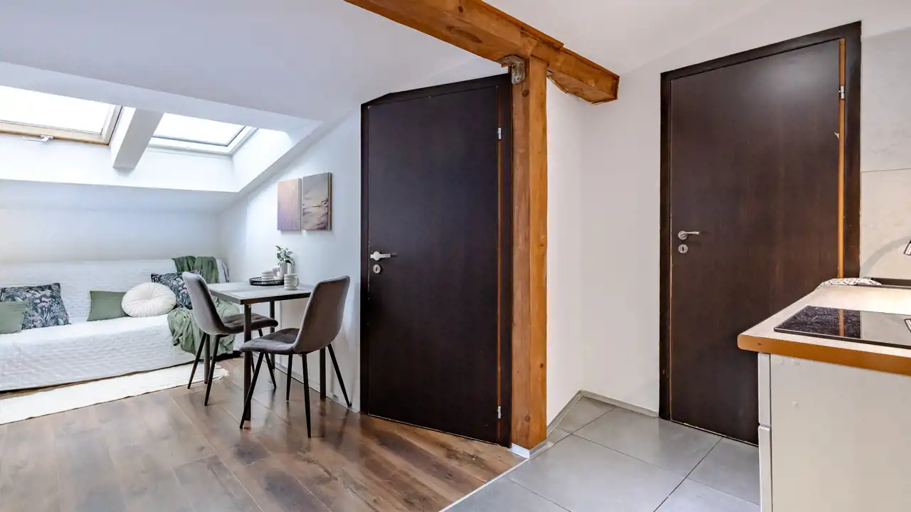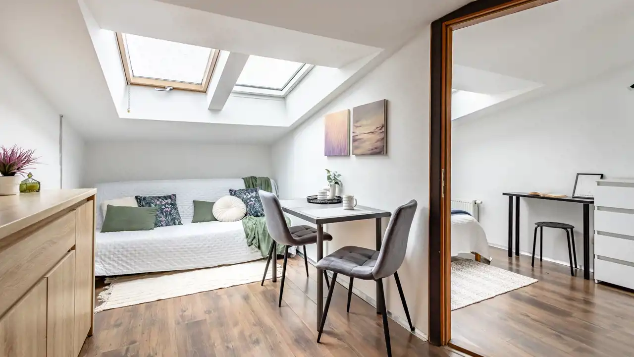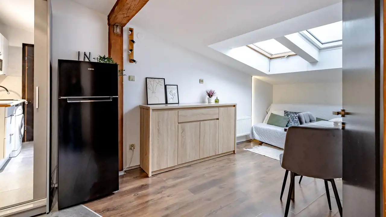 The apartment is situated on the fourth floor of a well-maintained tenement building (no elevator). Large roof windows make the interior exceptionally bright. The apartment has been freshly renovated and consists of a living room with a kitchenette, a small bedroom, and a bathroom with a shower.