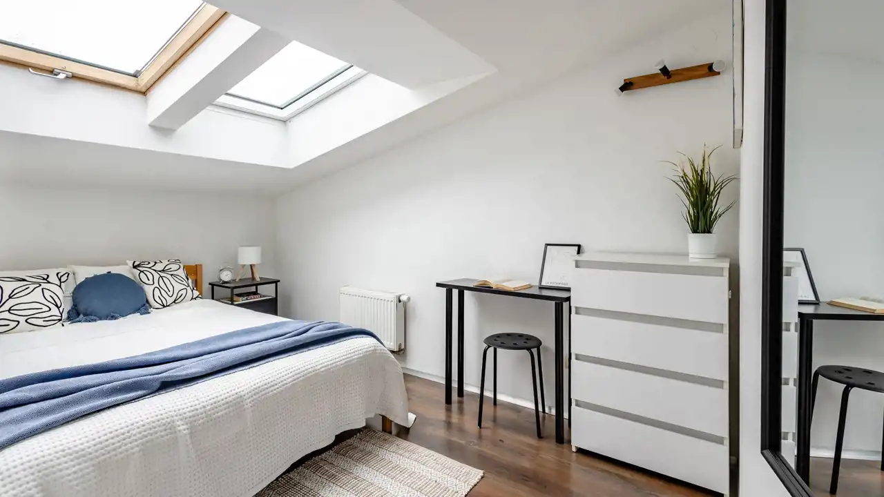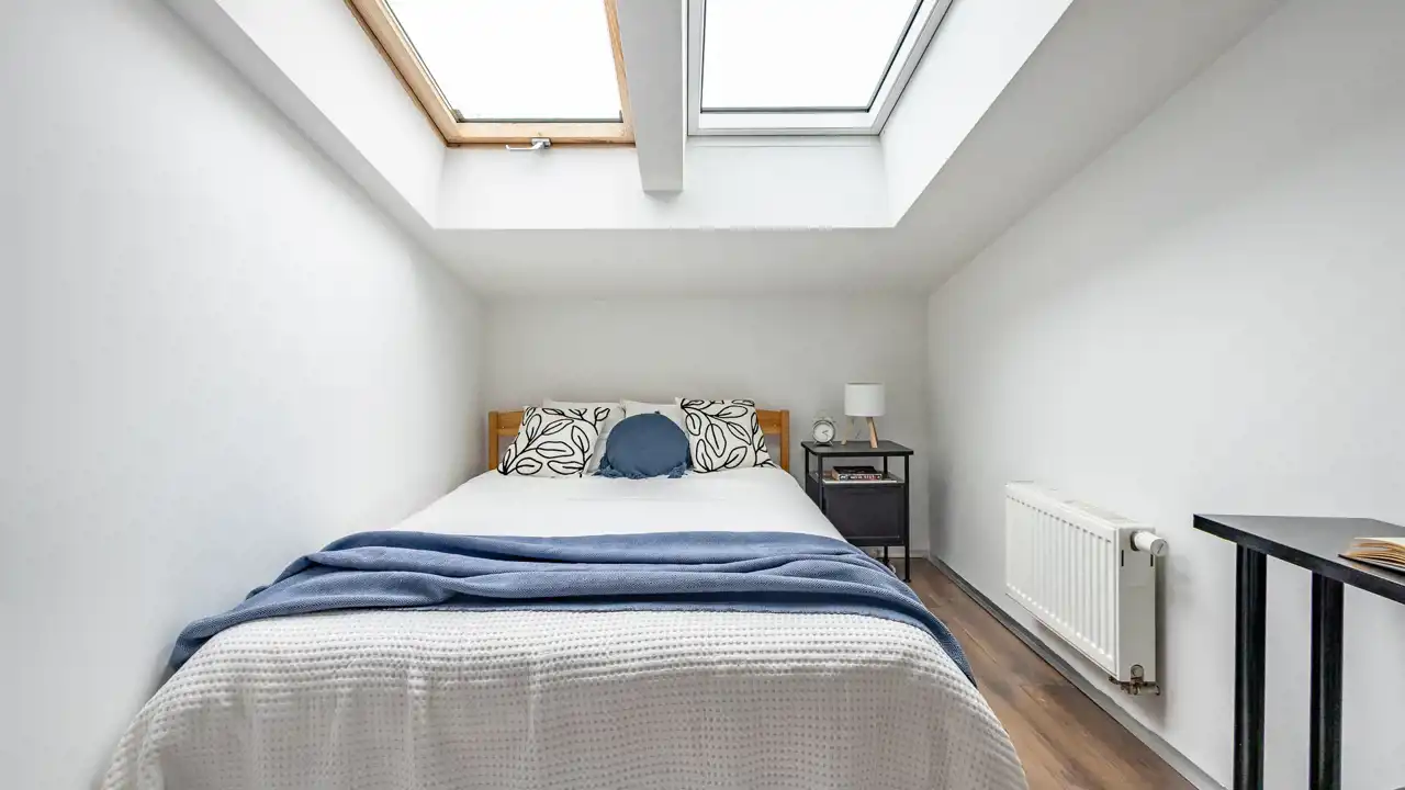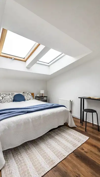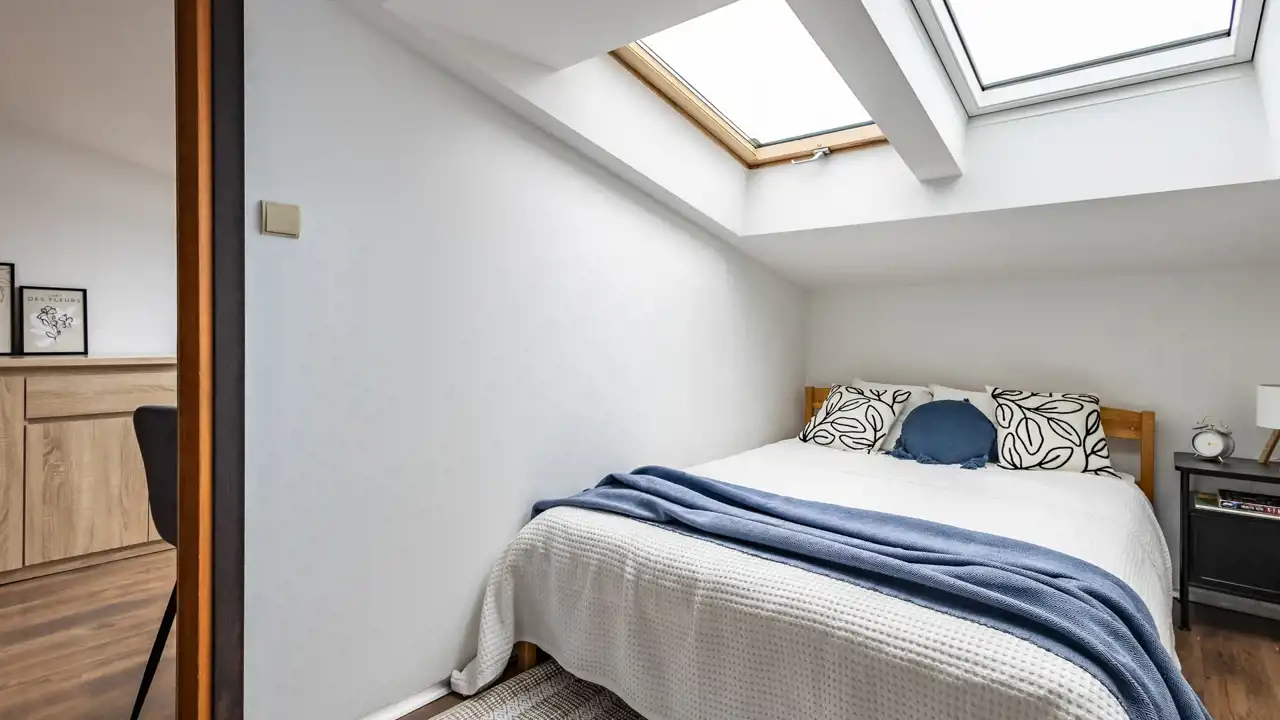 The apartment is situated on the fourth floor of a well-maintained tenement building (no elevator). Large roof windows make the interior exceptionally bright. The apartment has been freshly renovated and consists of a living room with a kitchenette, a small bedroom, and a bathroom with a shower.