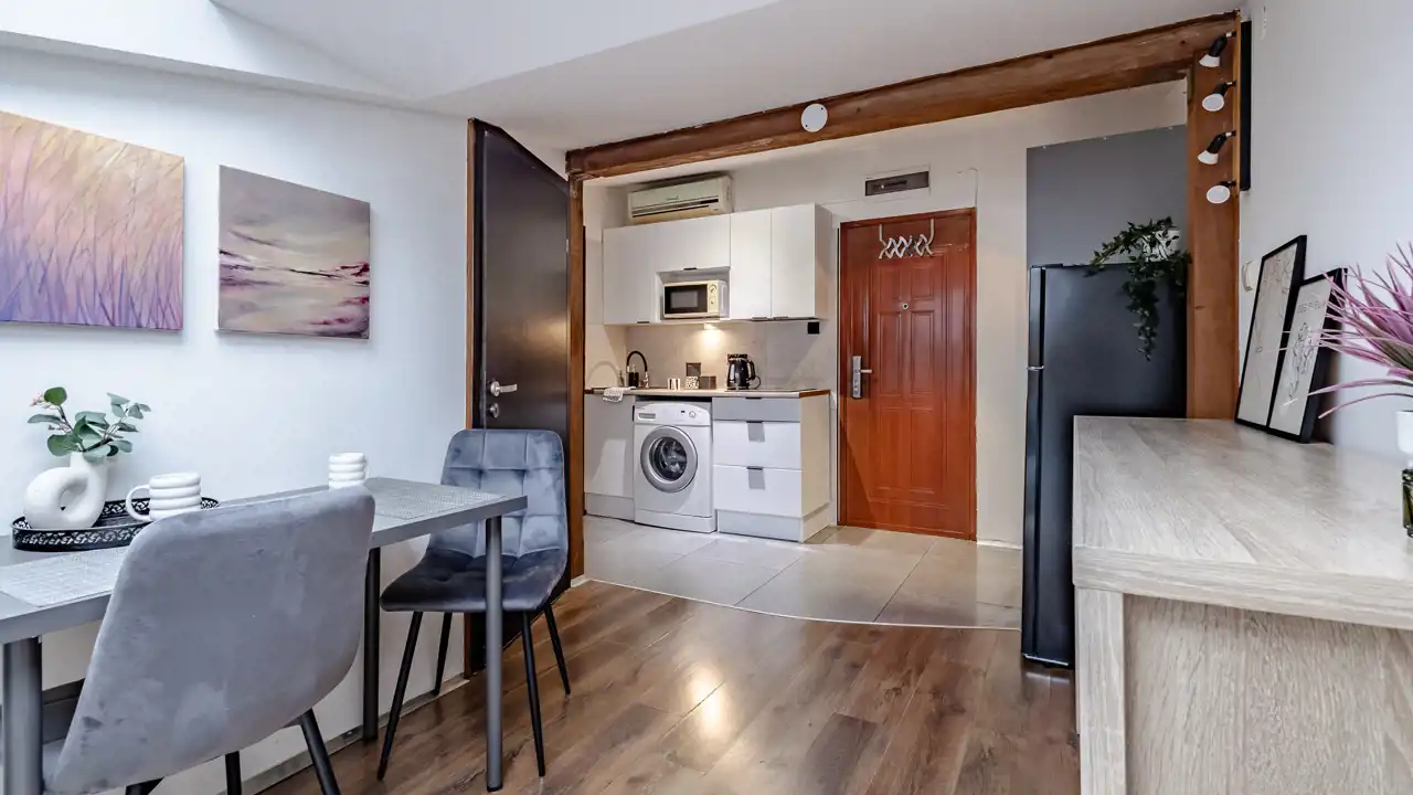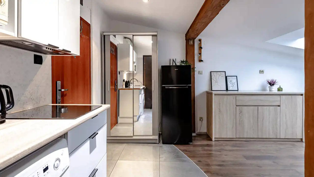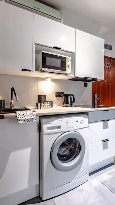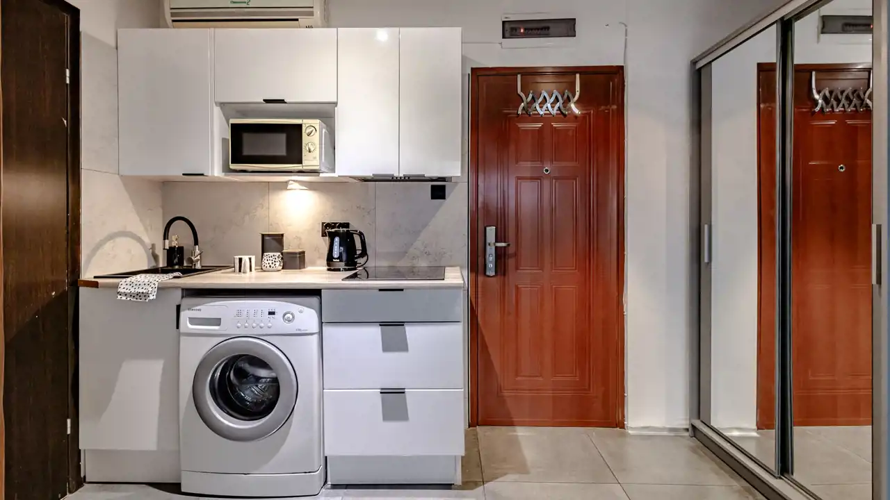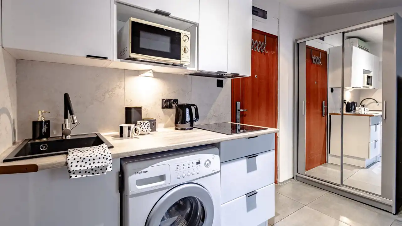 The kitchenette is equipped with household appliances: a washing machine, microwave, new ceramic cooktop, and a new freestanding refrigerator with a spacious freezer. The apartment is rented fully furnished and equipped as shown in the photos.