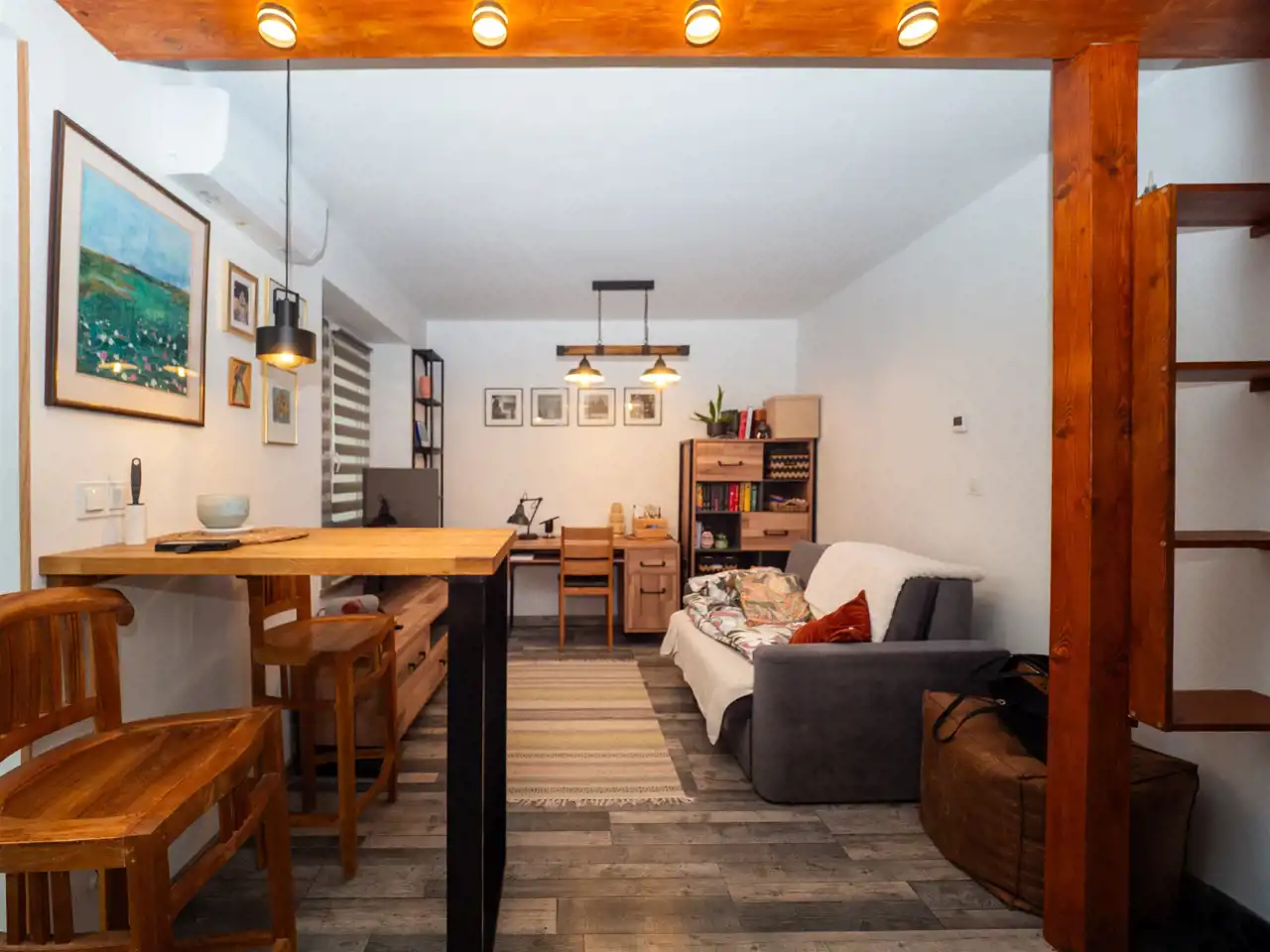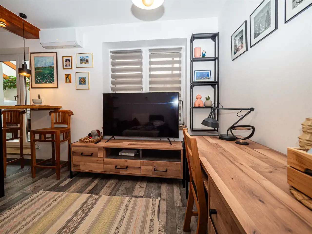 W części dziennej znajduje się rozkładana sofa (140x200 cm), biurko, krzesło, duży Smart TV, klimatyzacja, regały oraz szafka RTV.