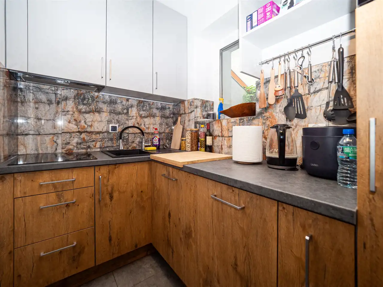 Część kuchenna wyposażona jest w zabudowaną lodówko-zamrażarkę, zmywarkę, piekarnik z funkcją mikrofali, płytę indukcyjną, ukrytą pralkę, stół z dwoma ręcznie ozdabianymi krzesłami oraz liczne szafki.