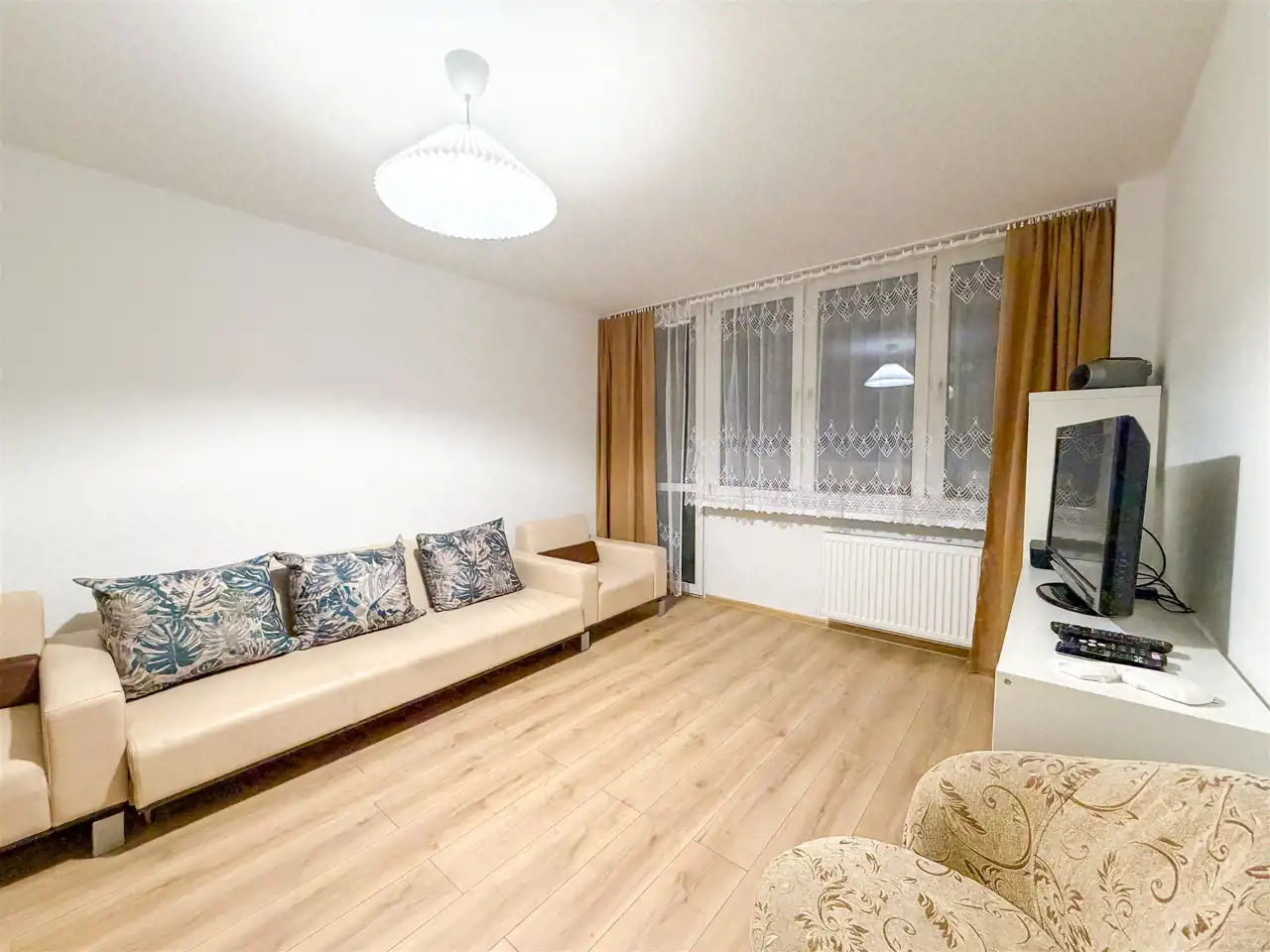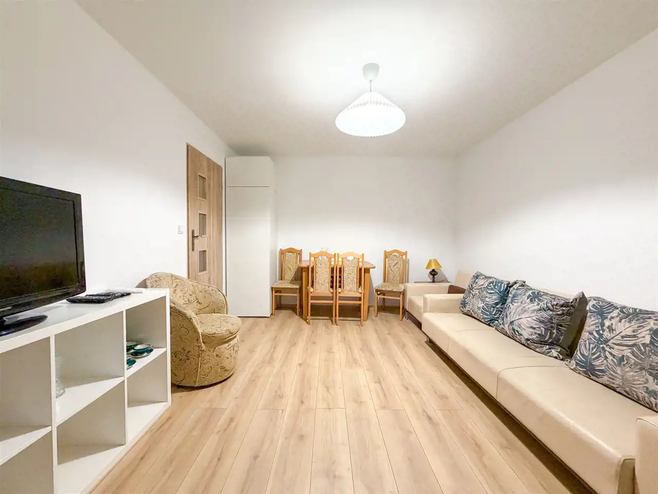 - Salon (odświeżony/wyremontowany): rozkładana skórzana sofa, fotele, stół z krzesłami, TV, dużo miejsca do przechowywania.