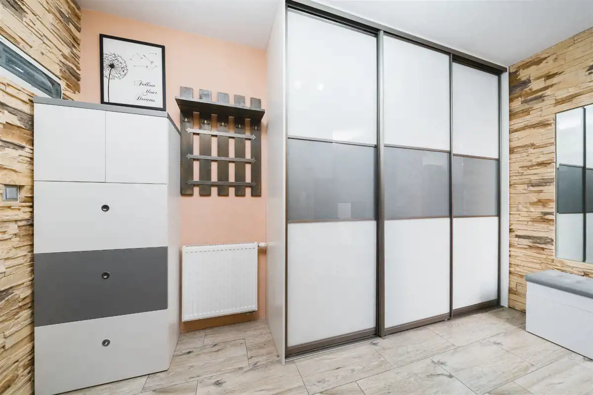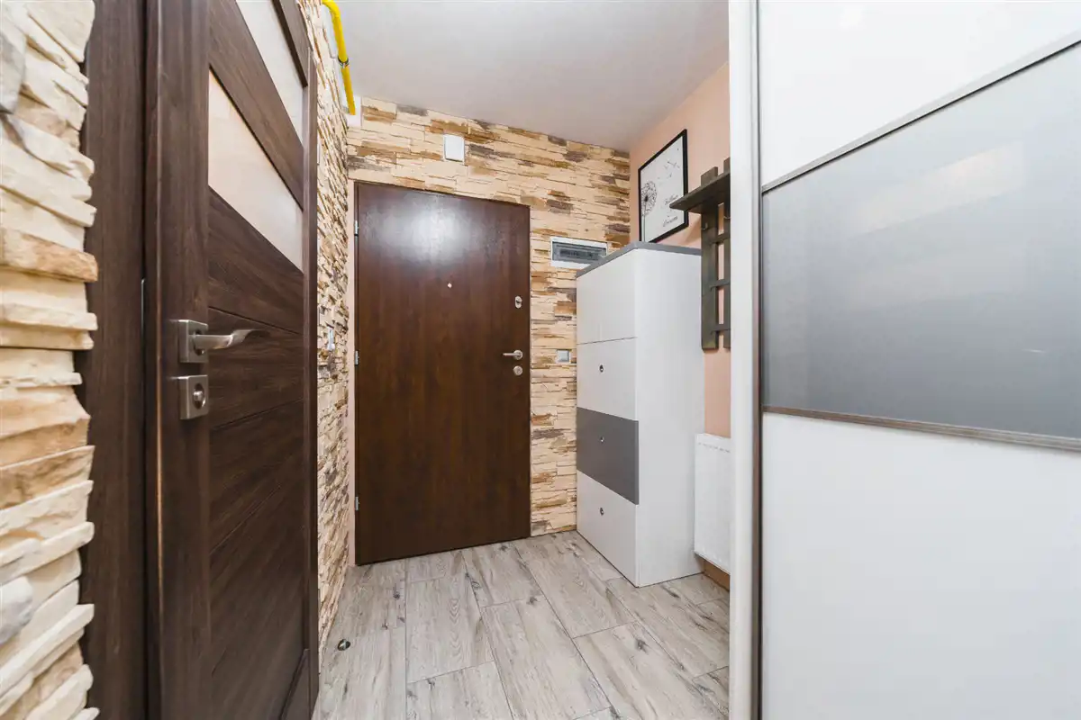 Mieszkanie składa się z dwóch pokoi, aneksu kuchennego, łazienki połączonej z toaletą oraz przedpokoju.
