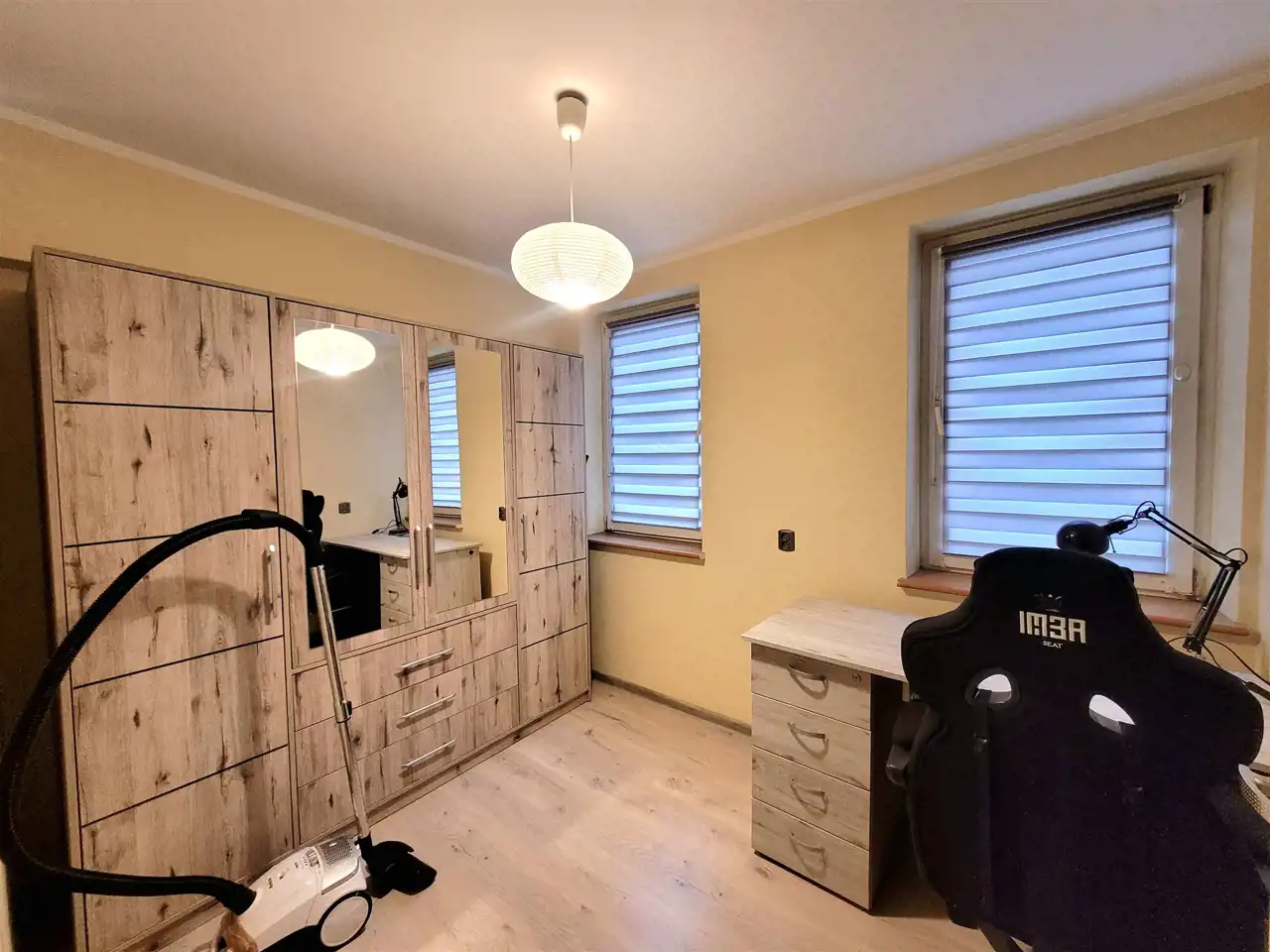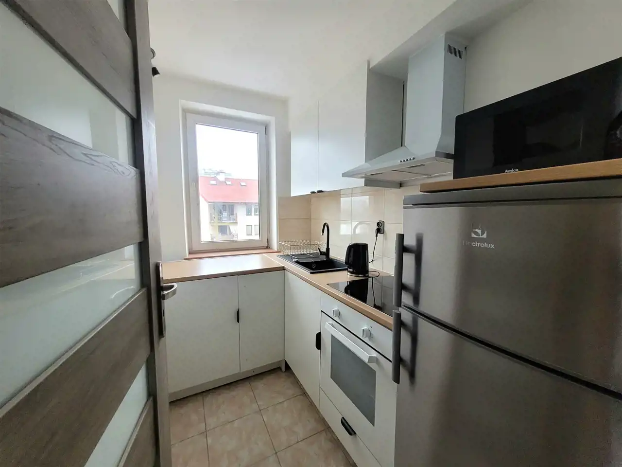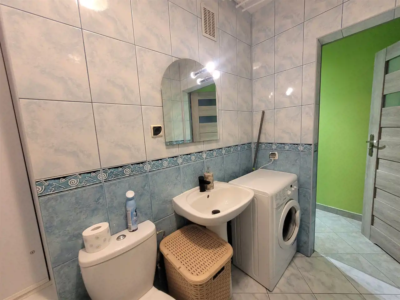 W wyposażeniu kuchennym jest lodówka, zamrażarka, okap, płyta oraz piekarnik. Przedpokój jest wyposażony w szafę. Łazienka posiada umywalkę, wannę , pralkę oraz lustro. Salon z sofą z opcją rozłożenia, stół z krzesłami i meblościankę. Pokój wyposażony jest w szafę, biurko i krzesła. Mieszkanie jest gotowe do zamieszkania. Mieszkanie znajduje się na czwartym piętrze bez windy.