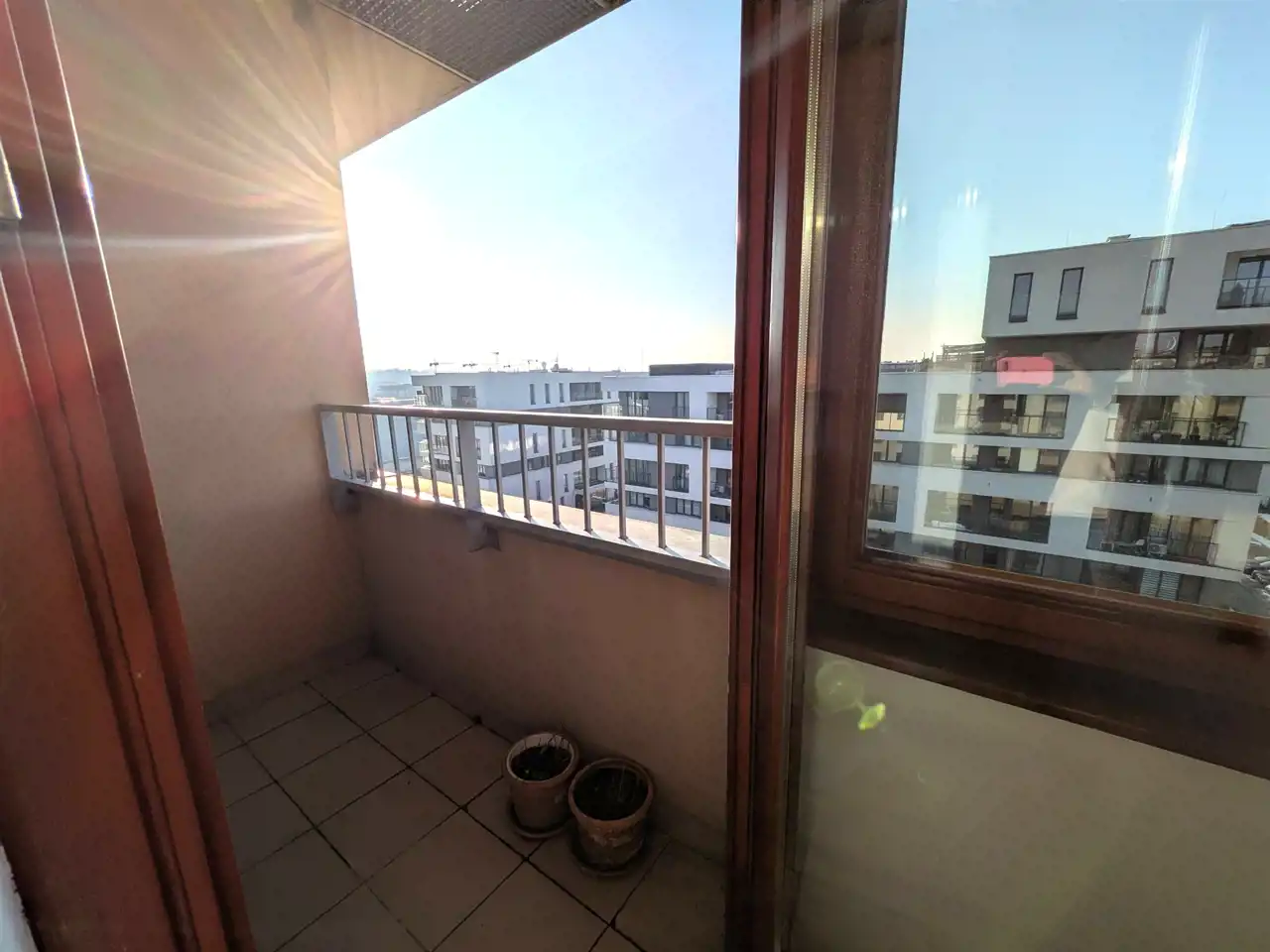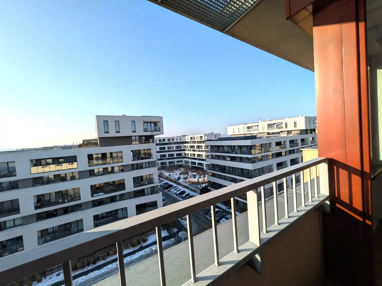 Przestronny balkon z widokiem na osiedle.