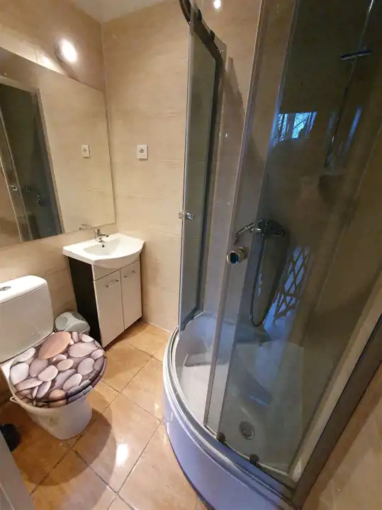 Entrance to the yard is through a gate. Furnished rooms, a kitchen with built-in furniture, and a bathroom with a shower, sink and toilet.