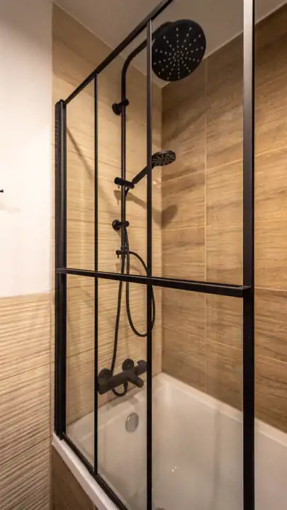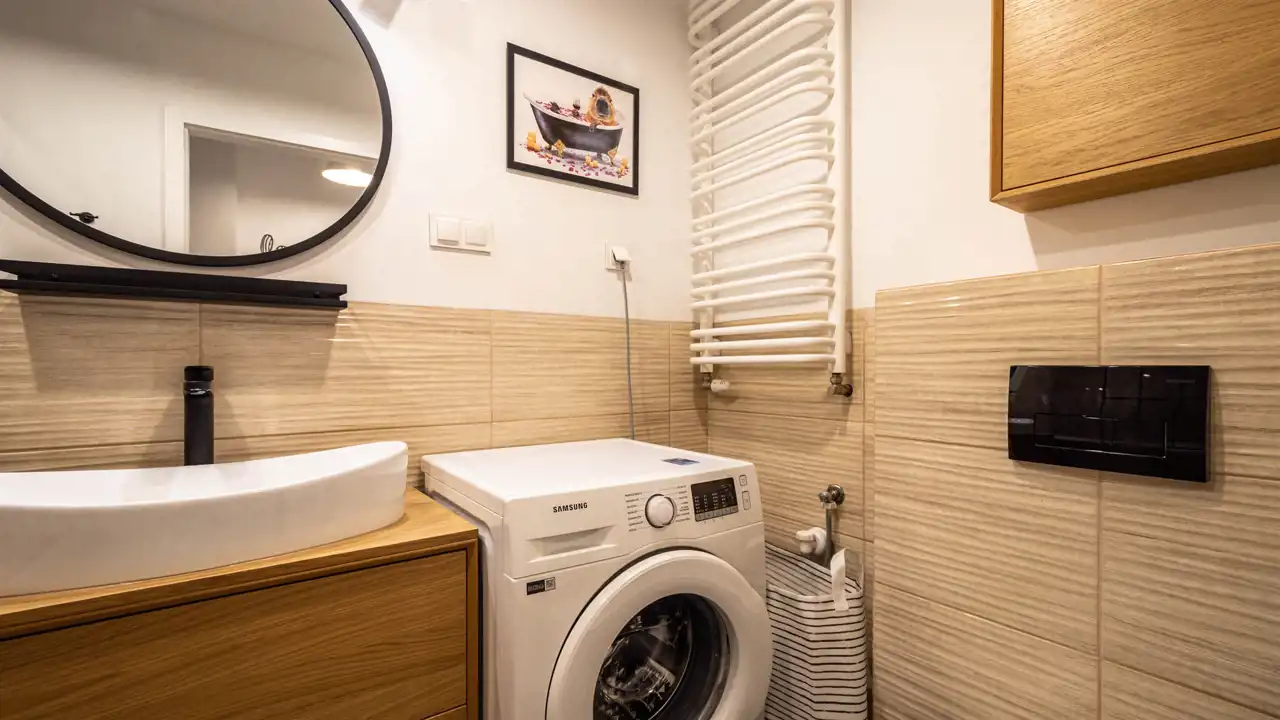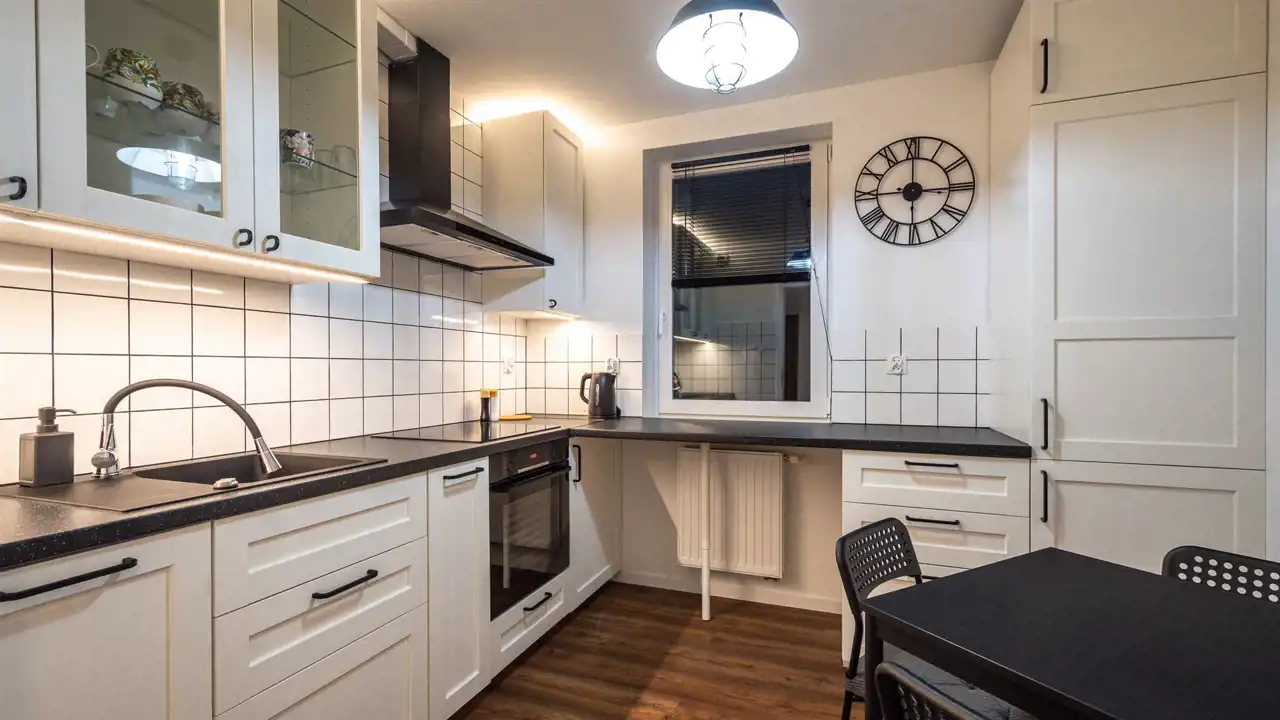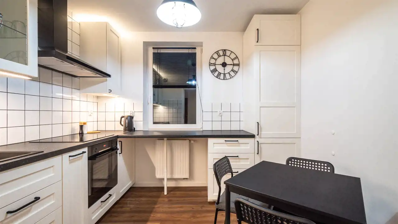 Kuchnia z zabudową, sprzęty AGD ( lodówko-zamrażalka, zmywarka, płyta, piekarnik, okap). Łazienka z wanną/ natrysk, pralka, pokoje umeblowane.