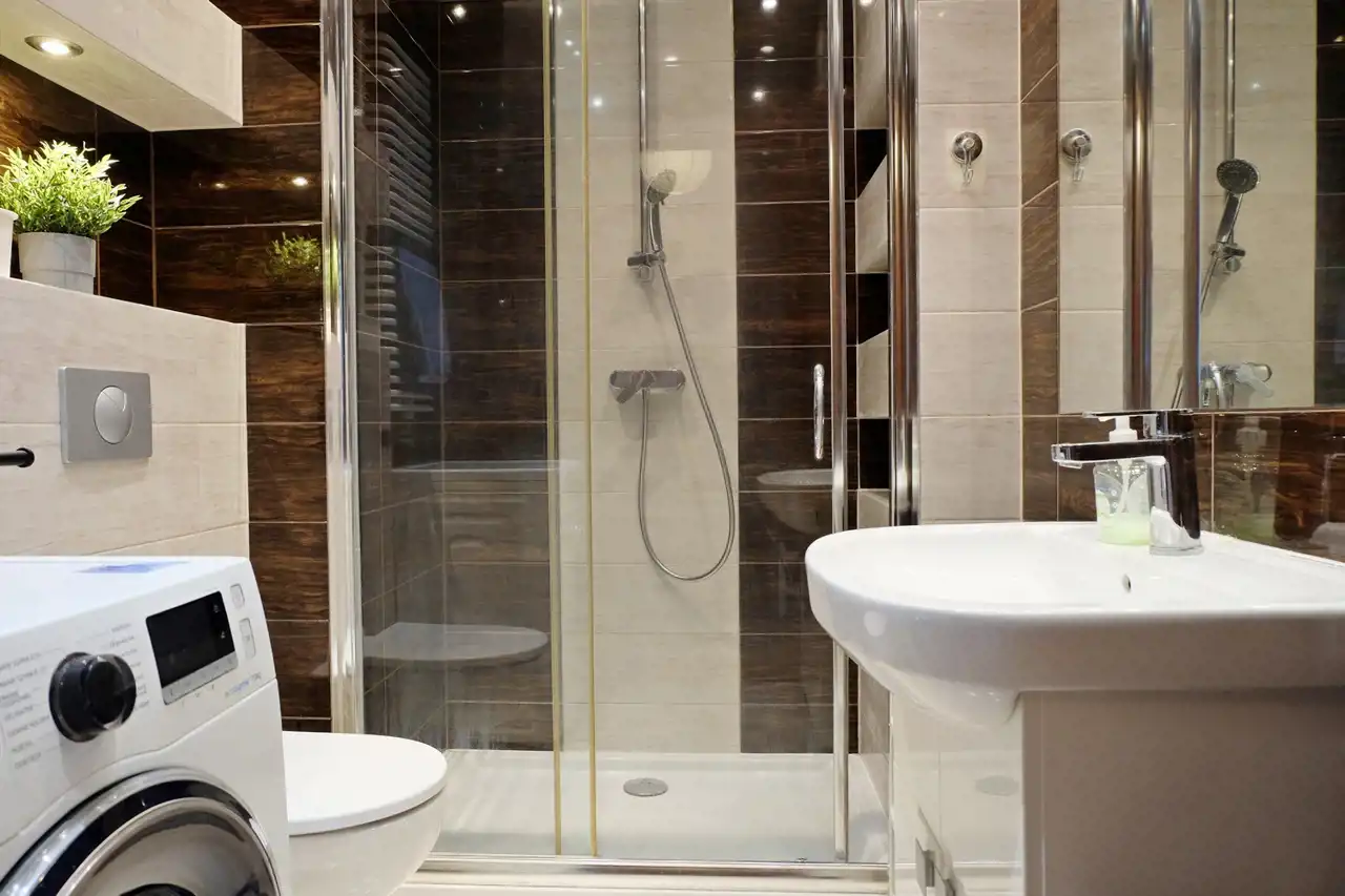 w łazience pralka, umywalka, szafki, prysznic, duży ręcznikowiec, wc.