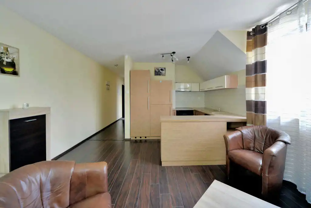 Do wynajęcia 2 pokojowe mieszkanie, położone na 2 piętrze apartamentowca na Woli Justowskiej. Przed budynkiem miejsce parkingowe, brama zamykana na pilota. Apartament o wygodnym rozkładzie - z przedpokoju wchodzimy do łazienki, sypialni i po drugiej stronie znajduje się salon z zabudowanym aneksem kuchennym, wyposażonym w dużą ilość szafek. Również w przedpokoju - zabudowana szafa wnękowa. Ogrzewanie - piec dwufunkcyjny.