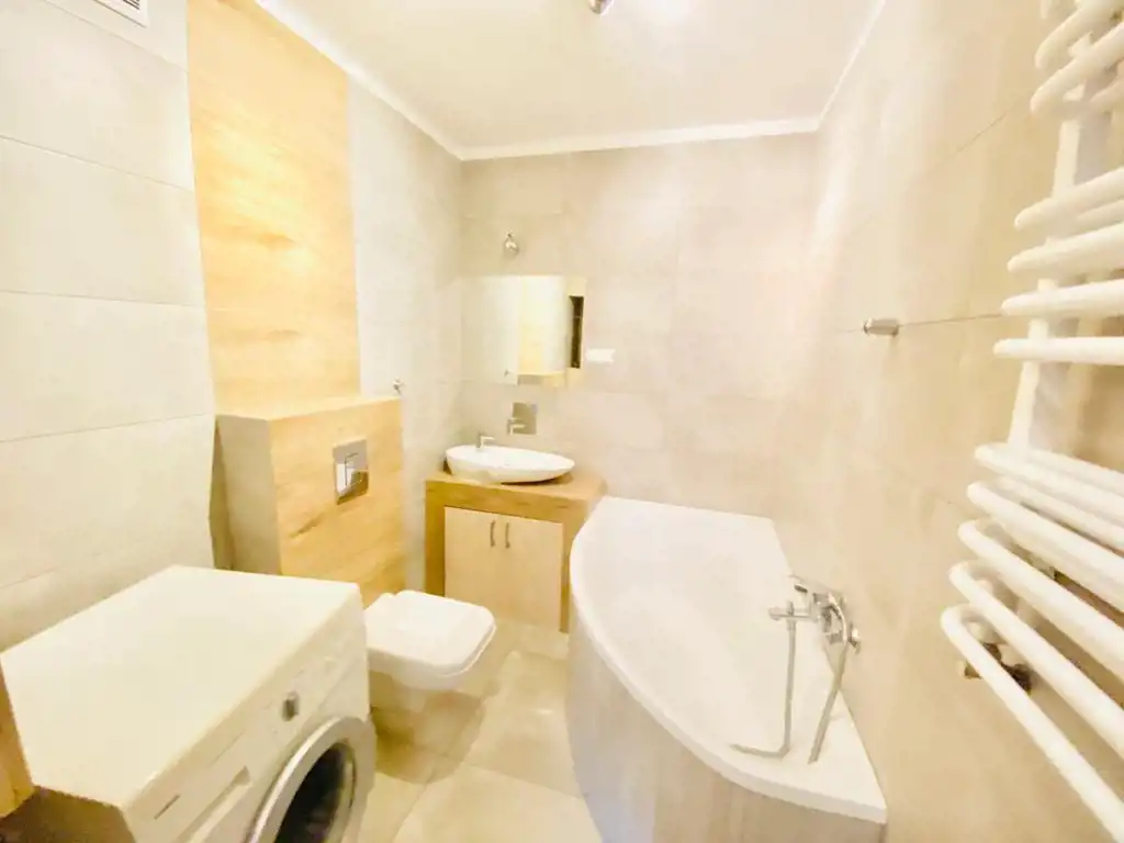 W kuchni znajduje się m.in. zabudowa kuchenna, lodówko-zamrażarka, zmywarka, płyta indukcyjna, okap, piekarnik. W łazience znajduje się wanna, umywalka toaleta oraz pralka.