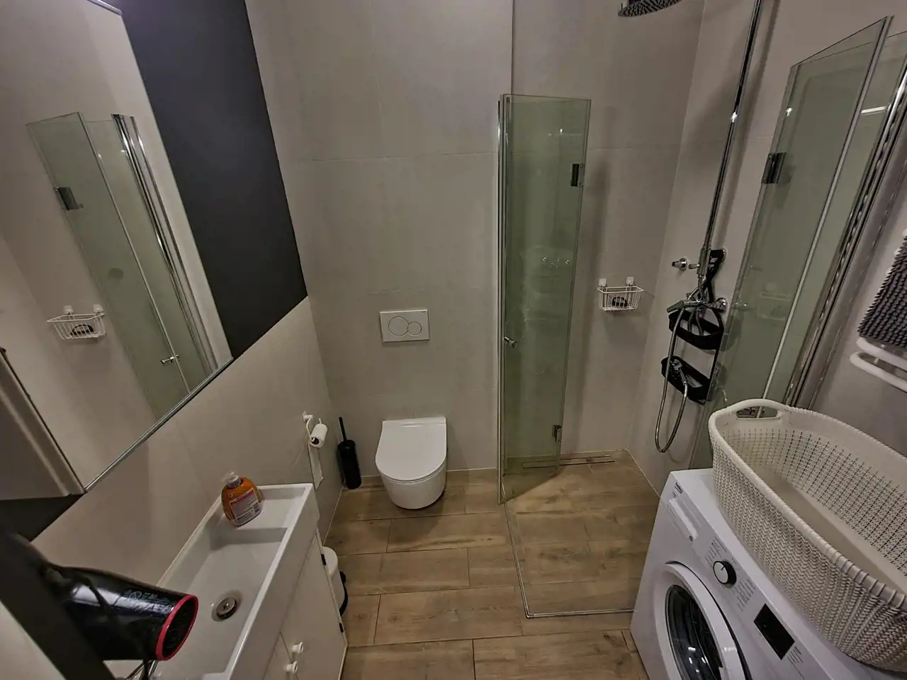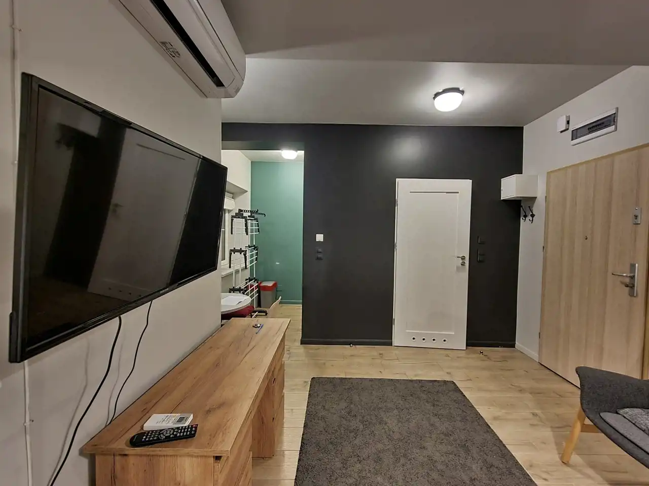 Wnętrze zostało zaprojektowane z dbałością o funkcjonalność i estetykę. Jasny salon z aneksem kuchennym jest w pełni umeblowany i wyposażony w klimatyzację oraz telewizor LED. Nowoczesna łazienka wykończona została w wysokim standardzie. Atutem nieruchomości jest przeszklona loggia z oświetleniem, pełniąca funkcję ogrodu zimowego – idealne miejsce do pracy, relaksu lub porannej kawy przez cały rok.