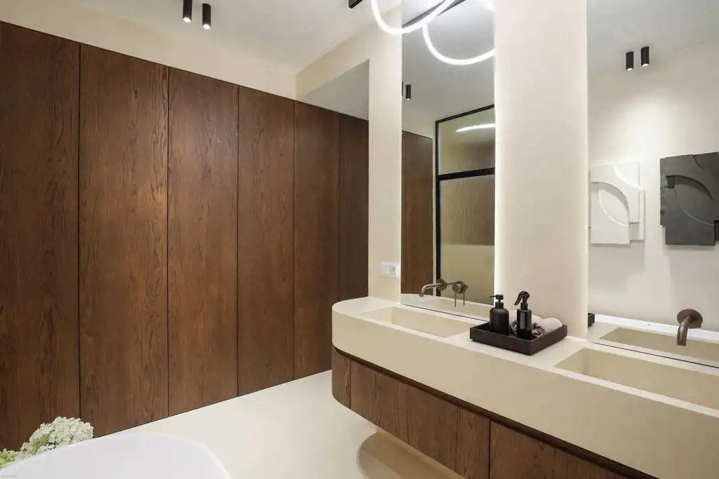 Apartament znajduje się na 1. piętrze kameralnego budynku z cichobieżną windą oraz całodobową ochroną. Na powierzchni 165 m2 znajduje się przestronny salon połączony z jadalnią i otwartą kuchnią, sypialnia master z garderobą i łazienką, oddzielna jasna sypialnia, łazienka, garderoba oraz hall.