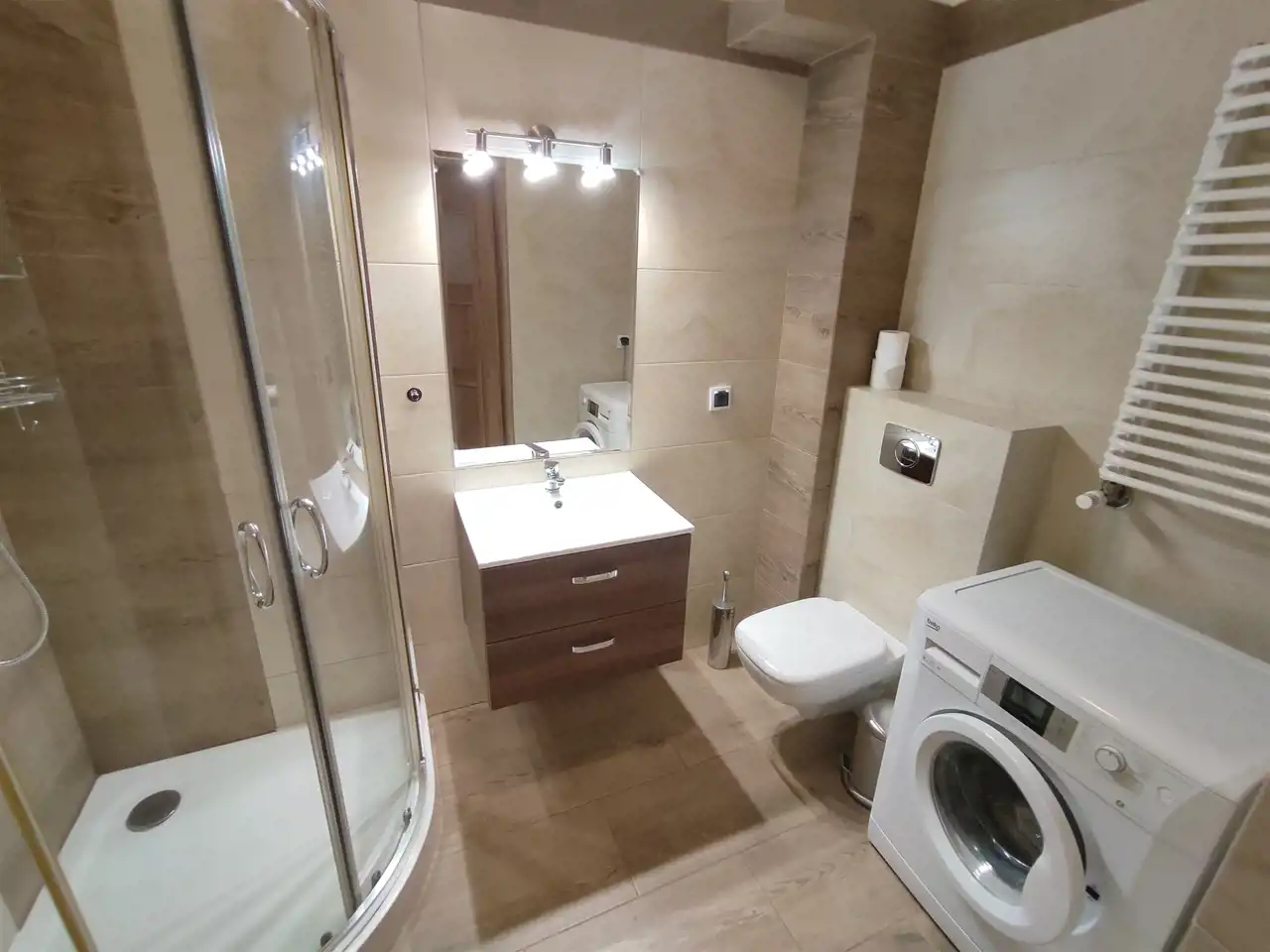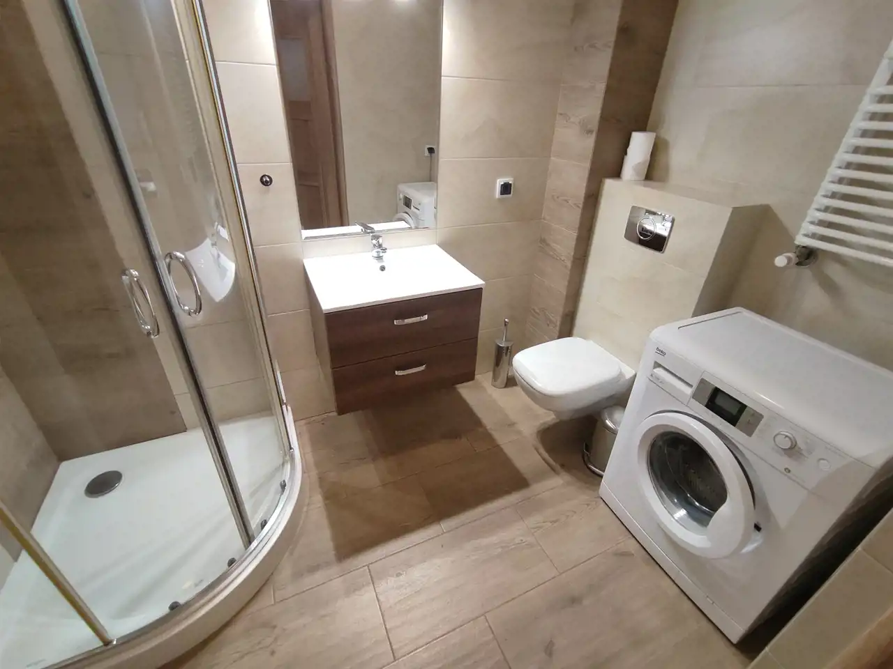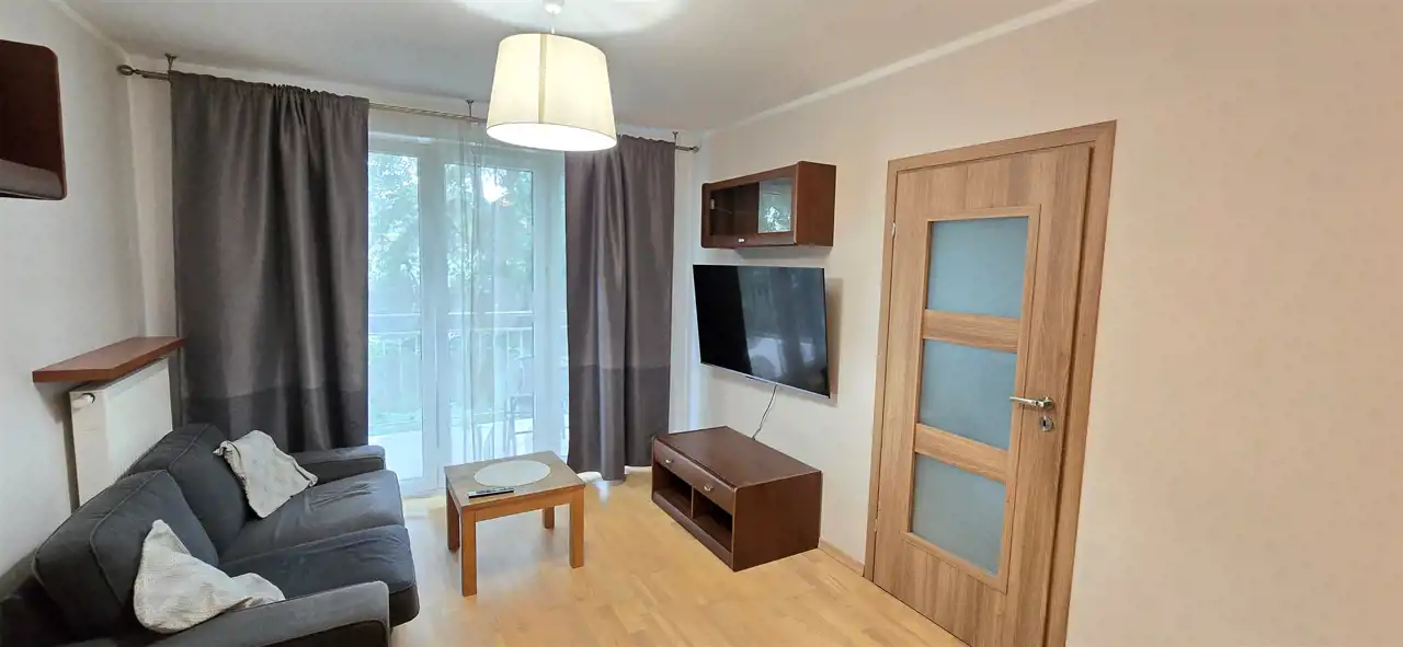 Mieszkanie w pełni wyposażone - pralka, lodówka, zmywarka, telewizor, płyta grzewcza, meble - w salonie sofa, w sypialni dwuosobowe łózko, szafa, biurko.